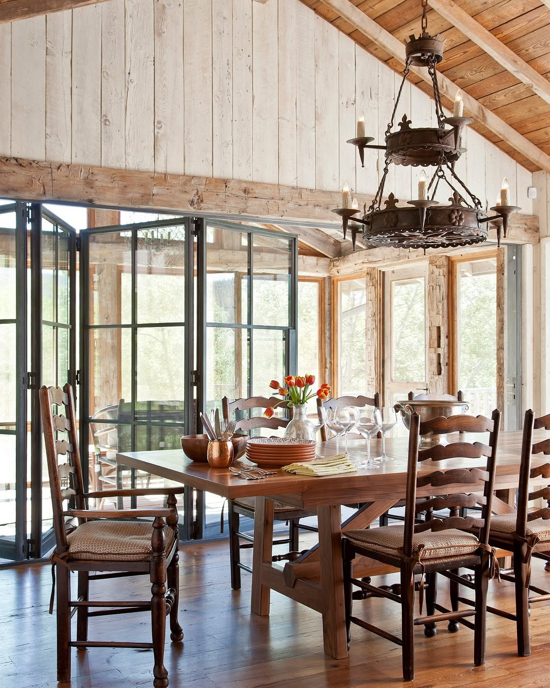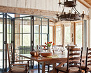 Природная цветовая гамма, необработанное дерево, массивная мебель — все это обязательно есть в рустикальном интерьере. Помимо дерева в отделке и оформлении используются и другие натуральные материалы: камень для пола, кожа или хлопковая ткань для обивки диванов, рога оленя в качестве основания для люстры и т.д.