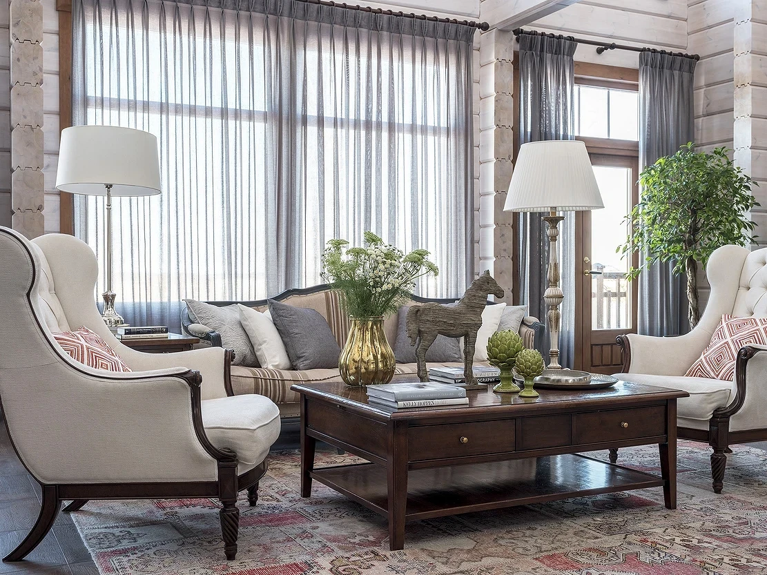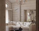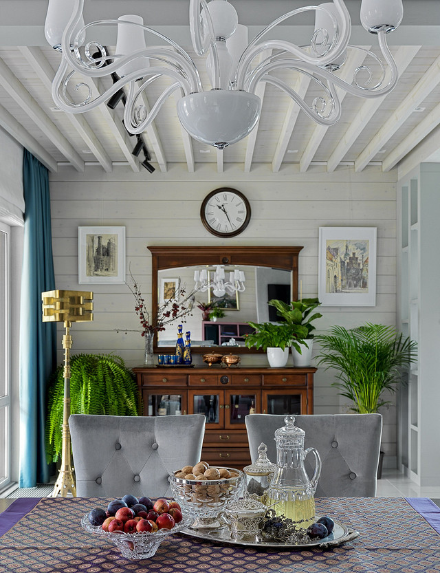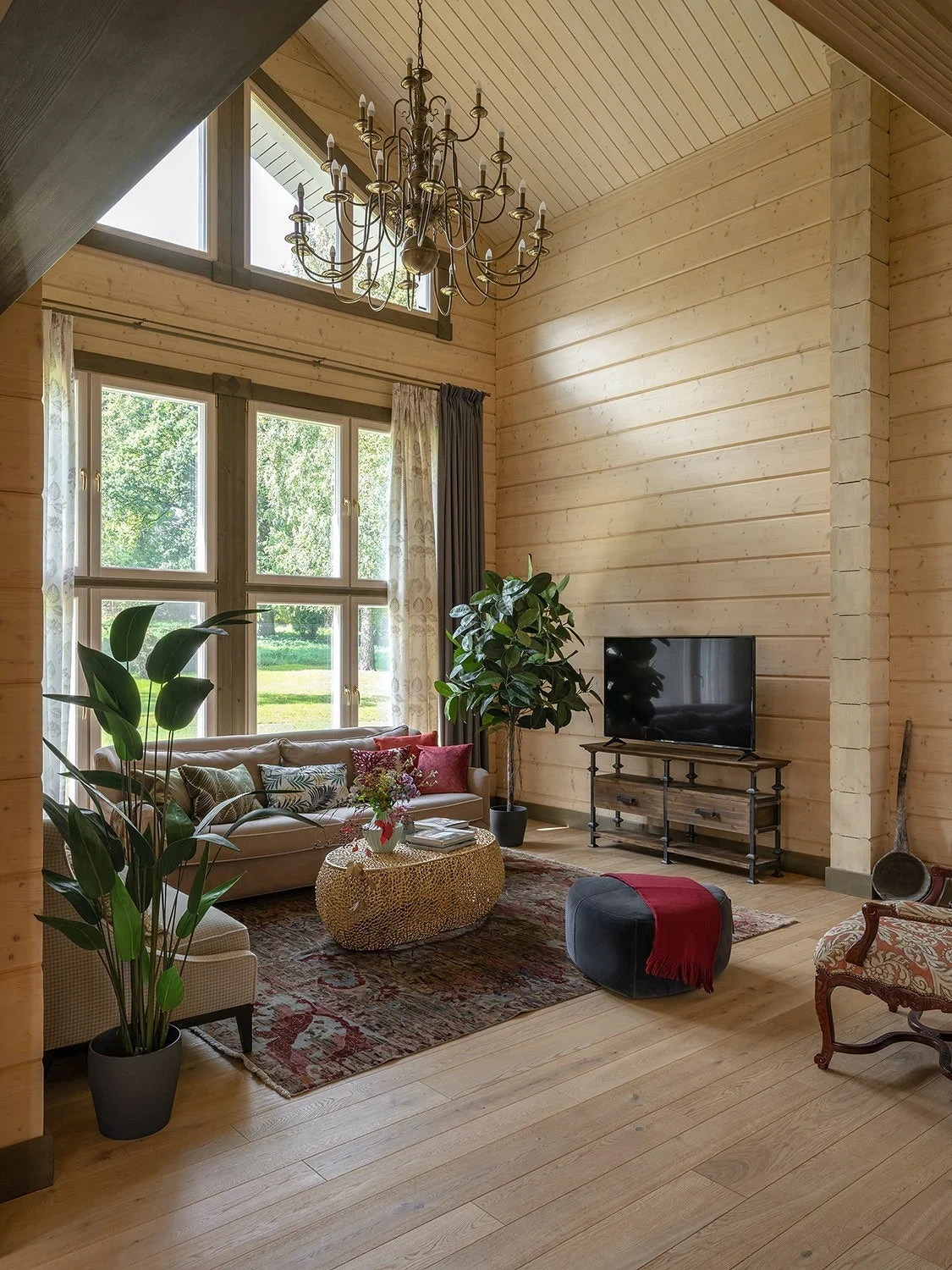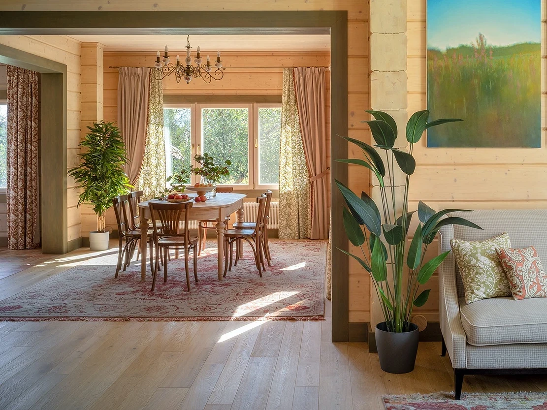 В отличие от рустика и кантри эта концепция не делает акцент на натуральности. Наоборот, брус выступает нейтральным фоном для классического убранства. А чтобы фактура древесины не перетягивала внимание на себя, ее делают максимально незаметной: на пол кладут паркет или инженерную доску, потолок красят в белый, а стены — в пастельные тона. Остается только добавить роскошную хрустальную люстру, расставить симметрично мебель — резную, с изогнутыми ножками или, наоборот, элегантно-строгую — и убедиться, что интерьер выполнен в неярких тонах, сочетающихся между собой.