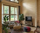 В современном доме из бруса интерьер гостиной вполне можно оставить «как есть»: деревянные стены легко станут главным акцентом оформления.
