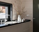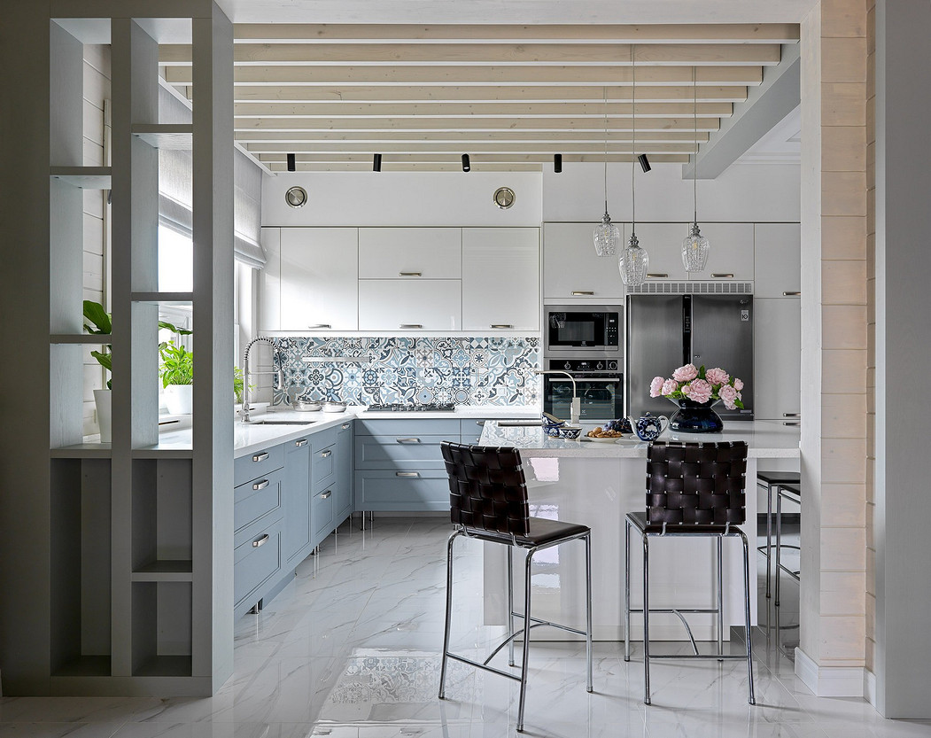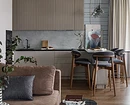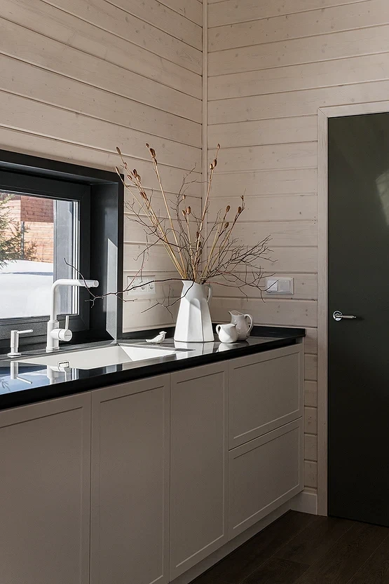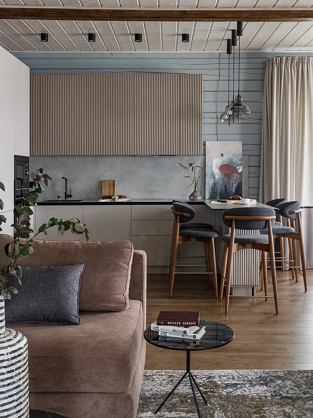 Хорошей идеей будет установить деревянный кухонный гарнитур со столешницей из массива или «под камень». Однако не стоит оставлять фасады в естественном цвете (если только этого не требует выбранный стиль интерьера), иначе дерева в комнате получится слишком много. Лучше обратите внимание на лаконичные матовые комплекты, окрашенные в нейтральные оттенки (беж, серый, пыльно-синий и т.д.) с минимумом декора.