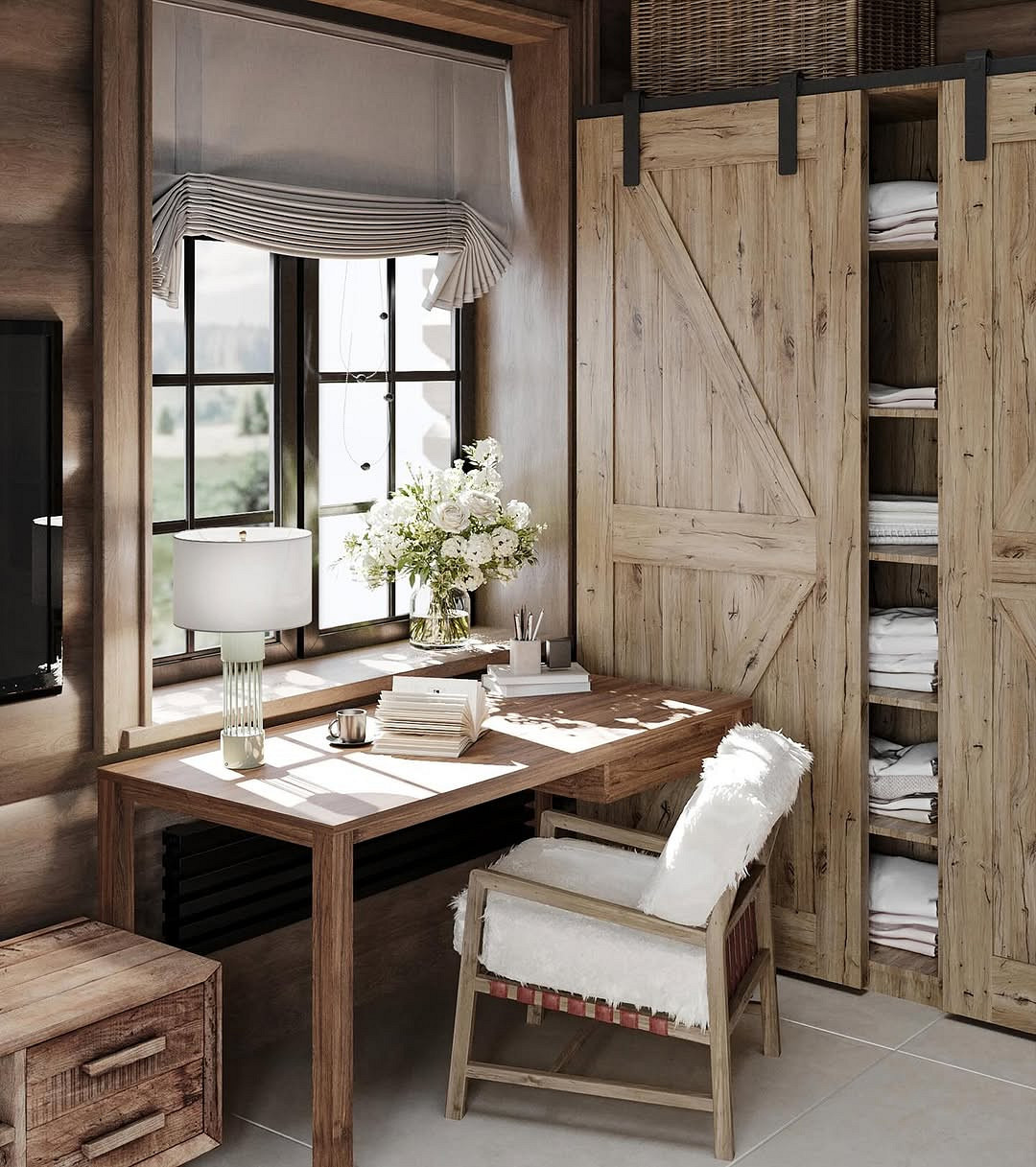 При этом не стоит стремиться заставить каждый свободный угол: деревянная комната, где слишком мало пространства, воздуха и света, мгновенно потеряет свою эстетику.