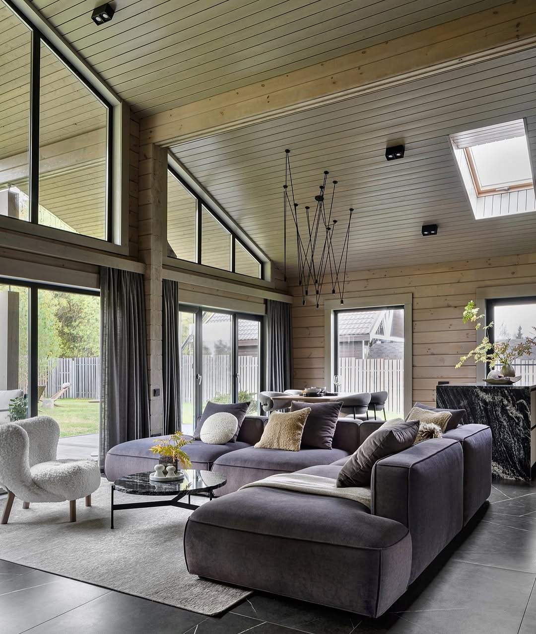 Архитектура таких домов обычно довольно стандартная — это одно- или двухэтажное строение со скатной крышей. Но если снаружи все подобные коттеджи выглядят похоже, то внутри их можно оформить совершенно по-разному.