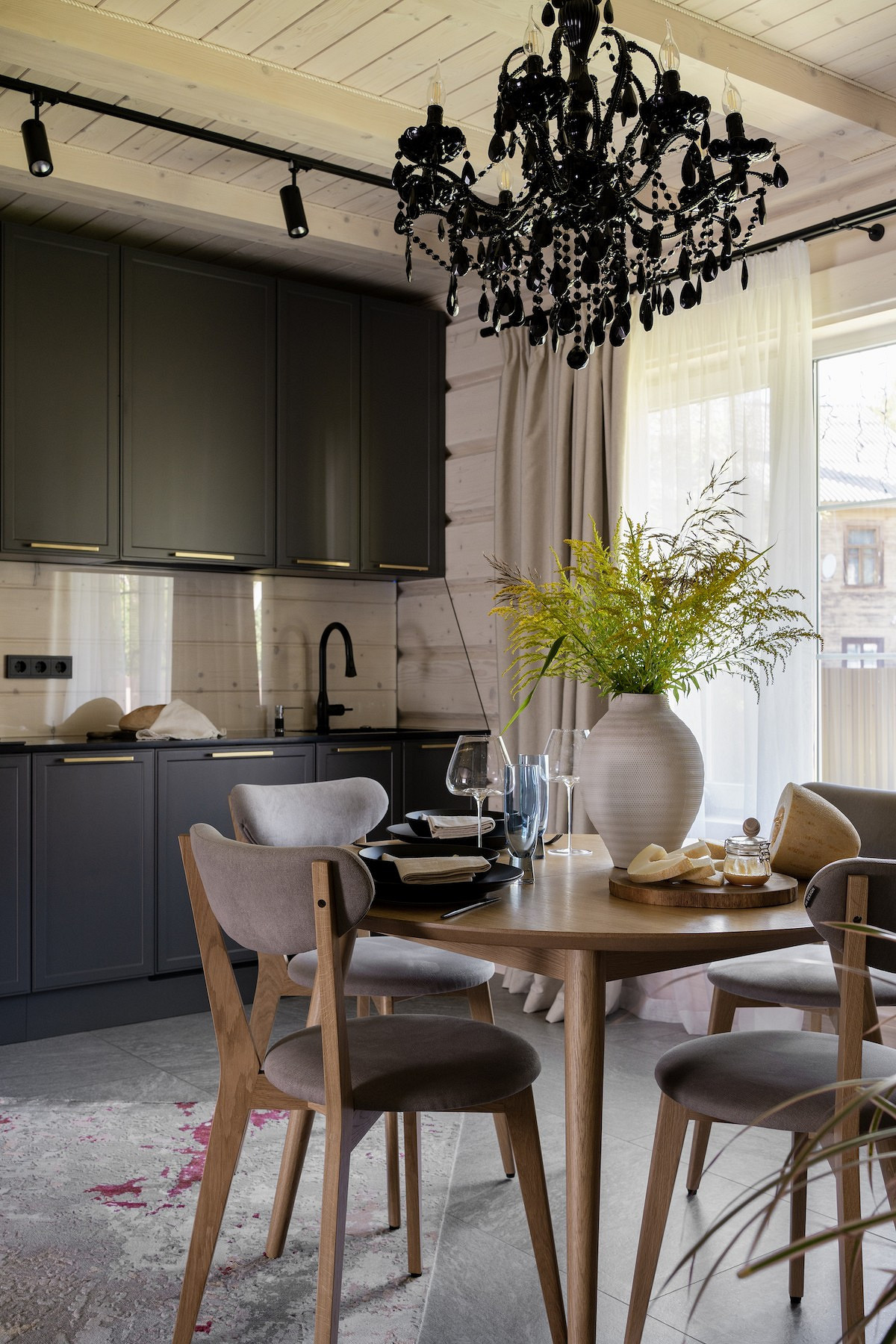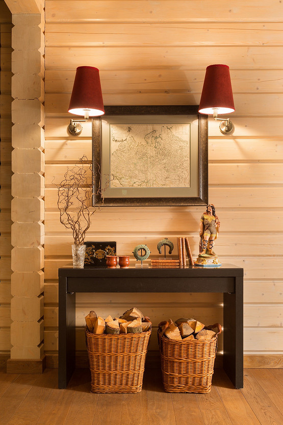 Подобрать подходящую мебель может оказаться непростой задачей. С одной стороны, она должна быть деревянной, ведь металл и пластик намного сложнее вписать в такой интерьер. Но в то же время столы, стулья, комоды и шкафы из необработанной древесины будут сливаться со стенами, поэтому для корпусных моделей следует выбирать окрашенное дерево. Диваны, пуфы и кресла подойдут с обивкой из натуральных материалов — от непритязательной рогожки до изысканной кожи. При этом их не должно быть слишком много, иначе за ними не будет видна красота деревянной отделки.