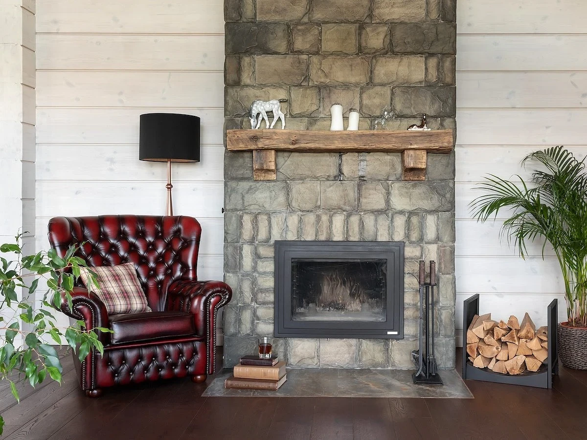 Камин — неотъемлемая часть обстановки в стиле шале. Однако в деревянном доме его установка не всегда оправдана: брус, даже обработанный пропитками от возгорания, все равно остается пожароопасным материалом, поэтому лучше купить полностью безопасный биокамин с имитацией огня.