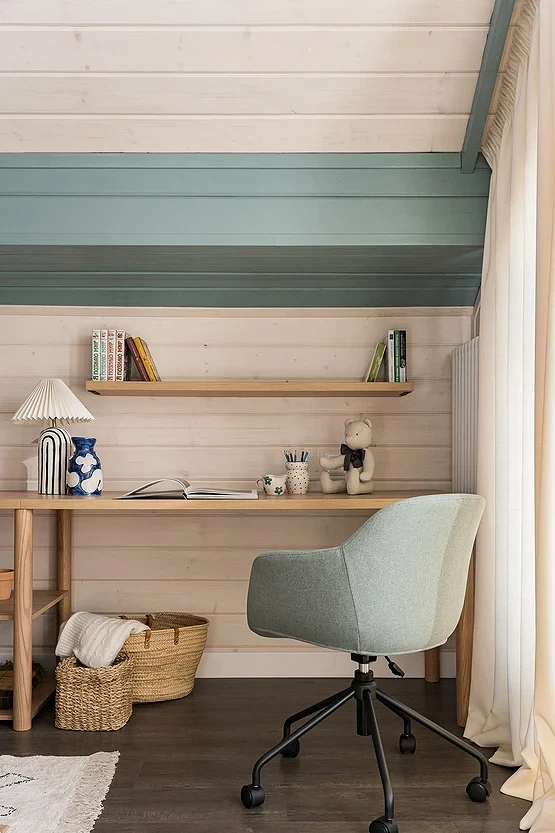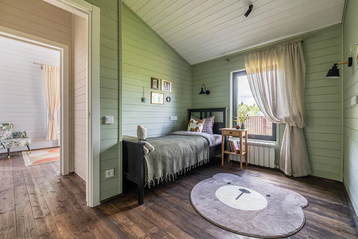 В детской комнате в доме из бруса, наполненной теплым уютным светом от деревянных стен, невероятно приятно играть и учиться. Впрочем, ее можно и покрасить в неброские природные тона.