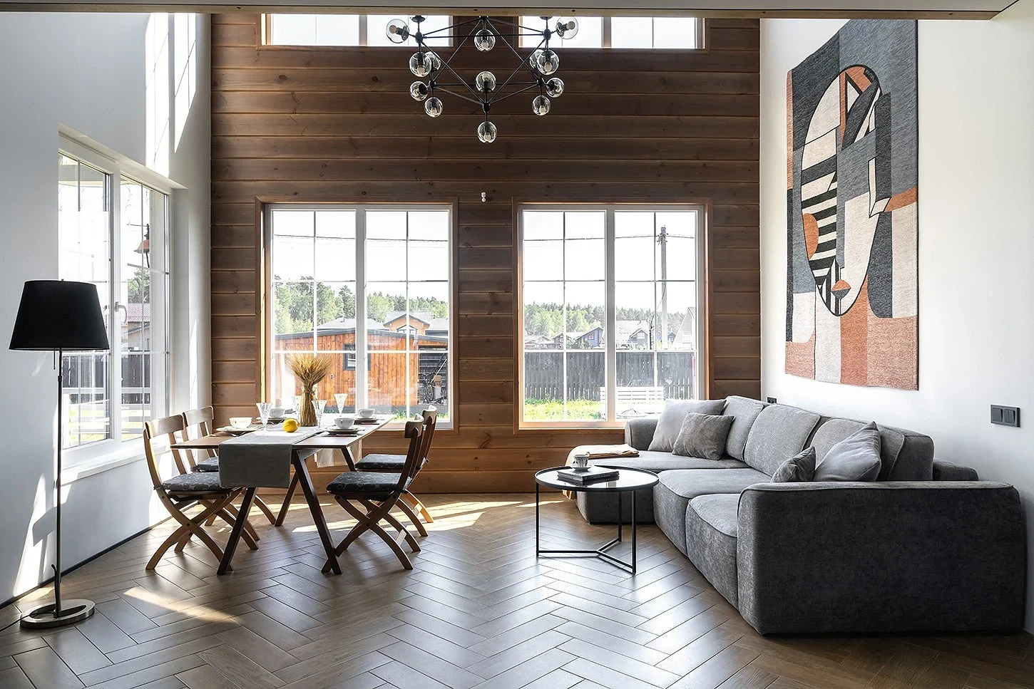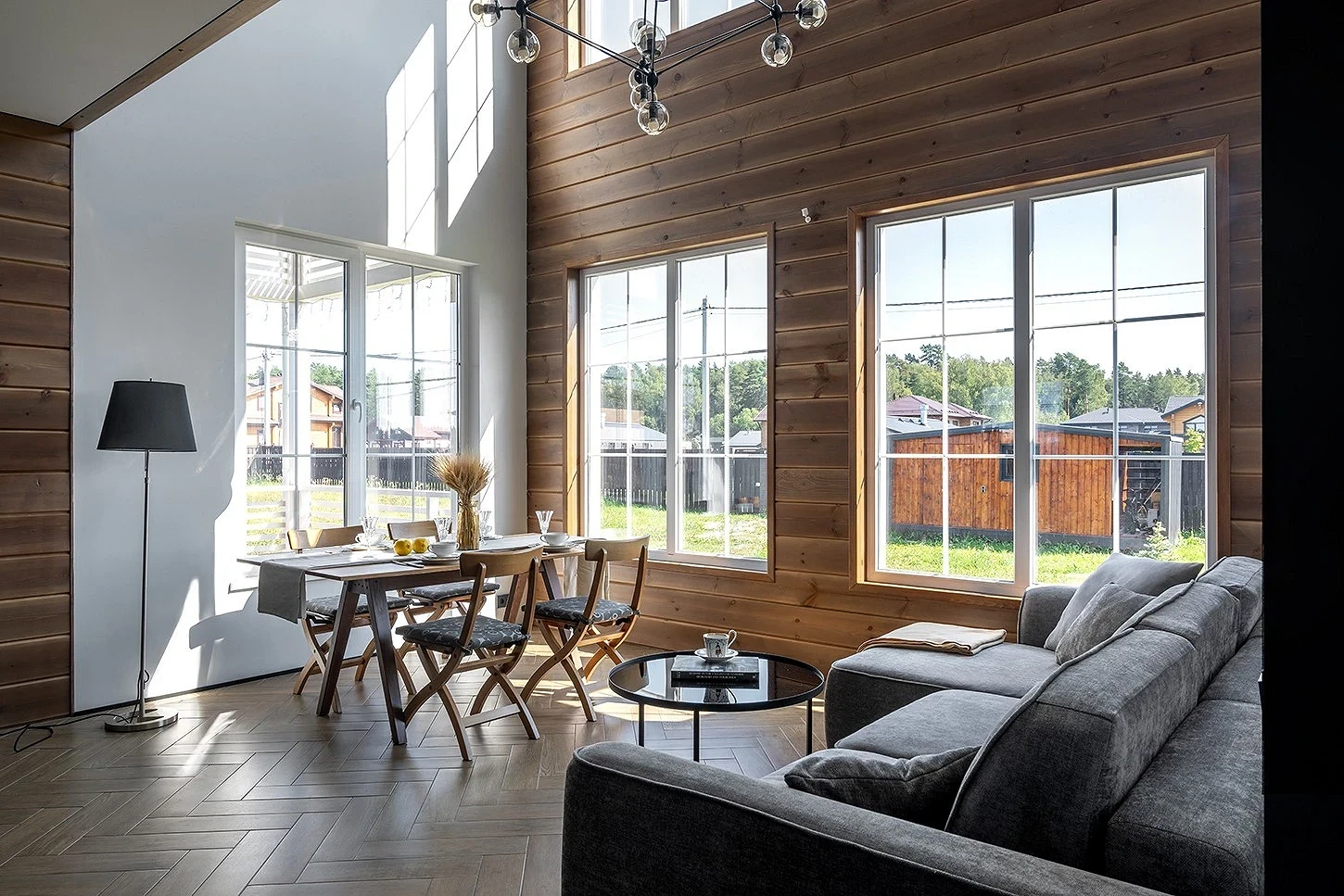 Дерево — исключительно выразительный элемент оформления интерьера, который не нуждается в сложных дополнениях, чтобы выглядеть эффектно. Поэтому дизайн деревянного дома из бруса обычно строится вокруг интересной фактуры и неповторимого рисунка этого материала. Чтобы обстановка выглядела гармонично, важно подобрать верные цвета, подходящую мебель и не перегрузить пространство деталями. Разбираемся, как это сделать.