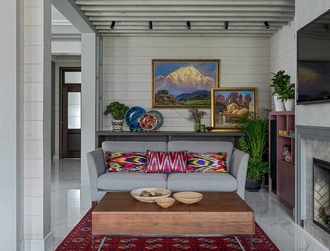 Диван, журнальный столик и другая мебель не должны быть слишком вычурными, иначе возникнет визуальная перегрузка. Зато абсолютно уместен крупный декор: напольные вазы с цветами, масштабные картины и, конечно же, камин.