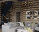 - Шале — это стилизация под охотничий домик с двускатной остроконечной крышей и балками на потолке. В гостиной должны быть шкуры животных на полу, трофеи на стенах и картины со сценами охоты. Почти всегда в комнате есть камин — настоящий или имитация — а для освещения используют люстру в форме колеса и кованые бра.