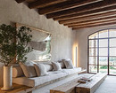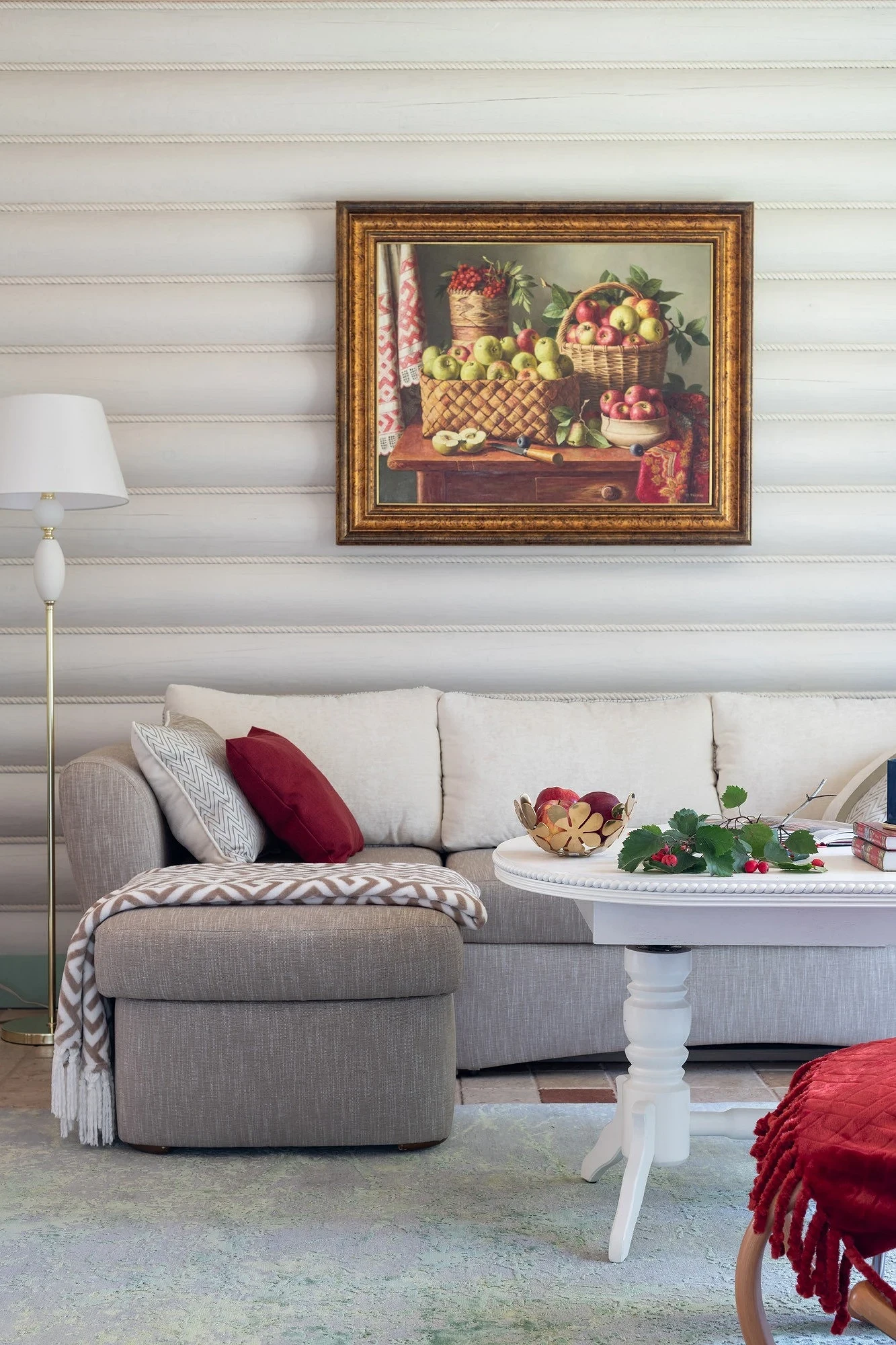 - Рустик — нарочито грубый стиль: в нем главенствует необработанное дерево с дефектами, которые подчеркиваются, а не маскируются. В качестве декора приветствуются массивные тяжелые изделия, зачастую функциональные — сундуки, плетеные корзины и т.д. В гостиной самое место будет столику из спила бревна и зеркалу в рамке из веток.