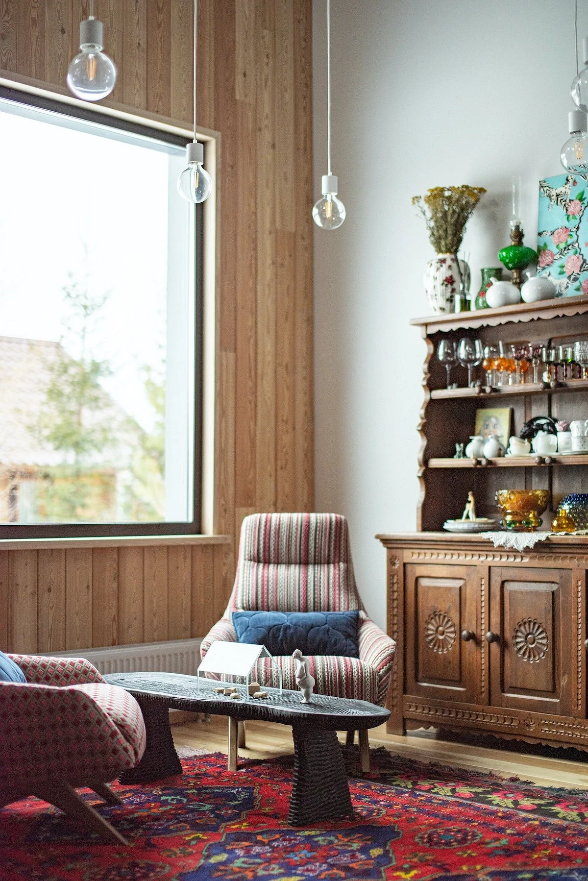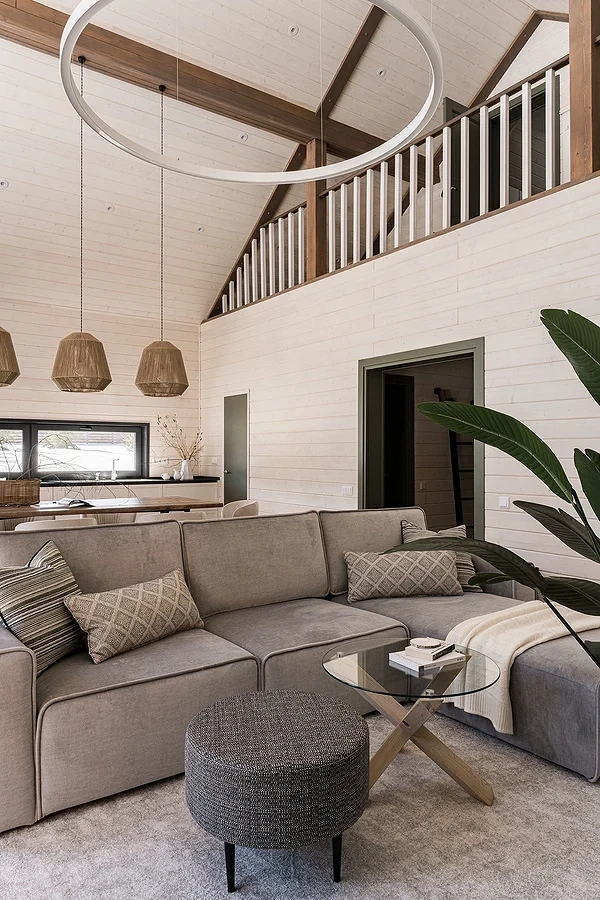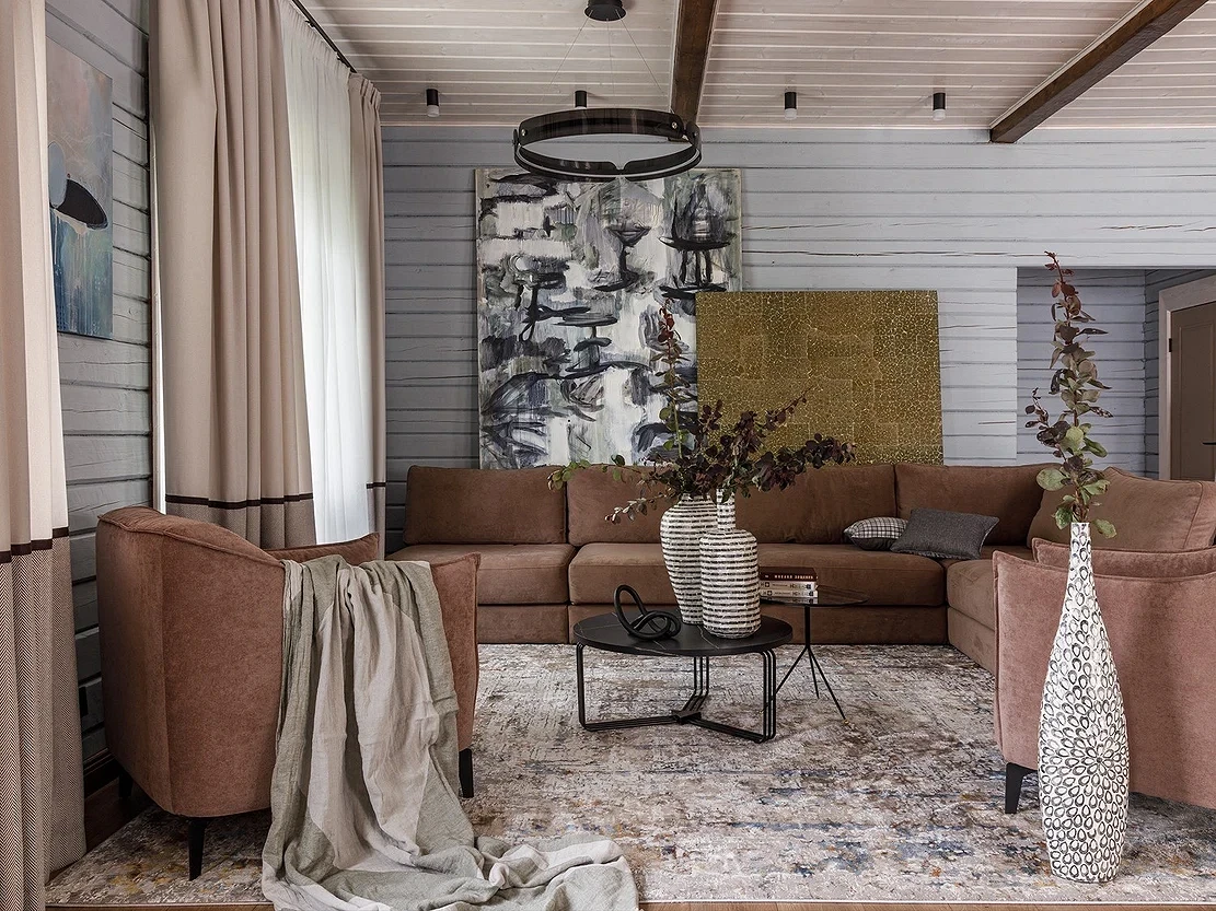 Гостиную в деревянном доме можно оформить в разных стилях, которые часто выглядят непохоже друг на друга, несмотря на то, что в основе у них — отделка из древесины. При этом разумнее всего отталкиваться от особенностей постройки — сруб из бревен больше подходит для кантри или рустика, вагонка и клееный брус прекрасно впишутся в сканди или экостиль, а треугольная крыша с балками идеальна для шале.