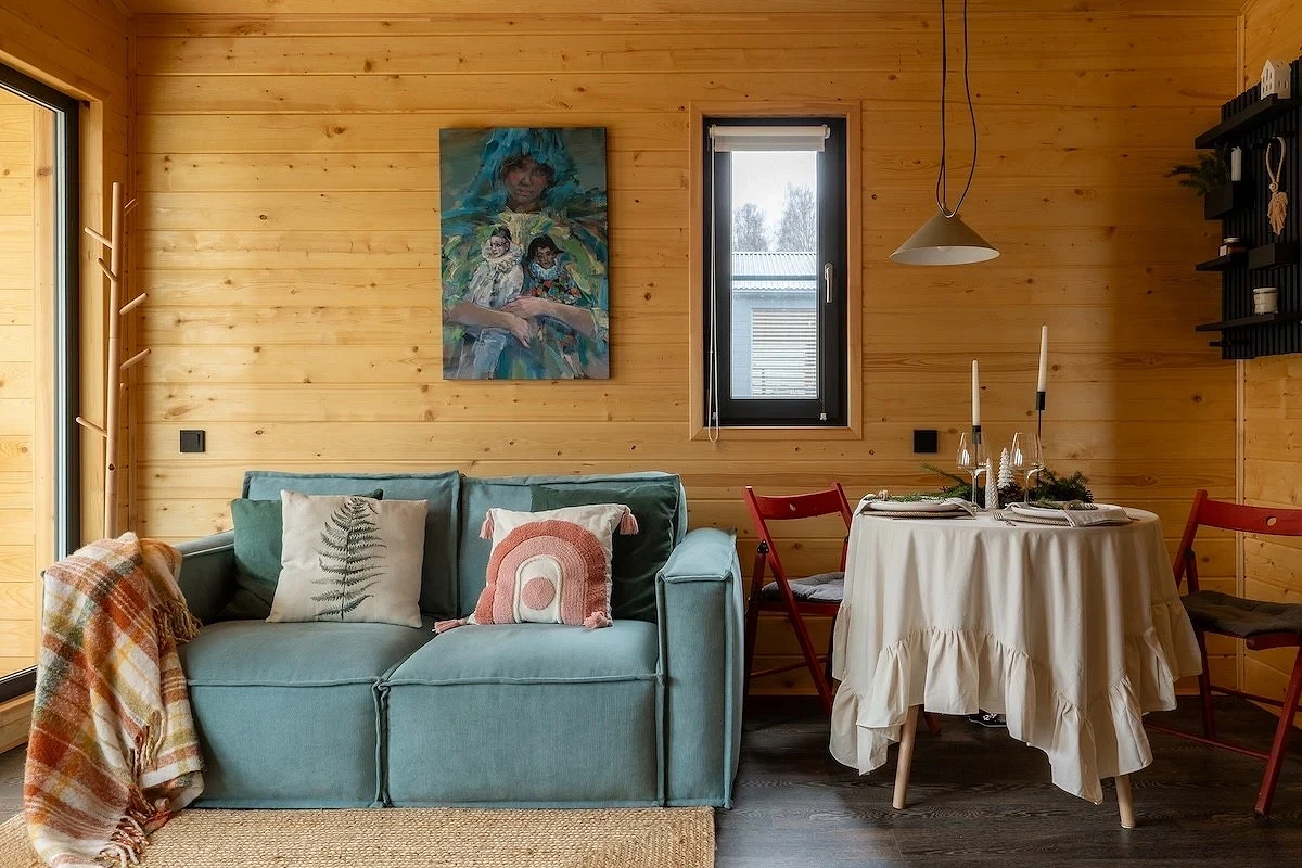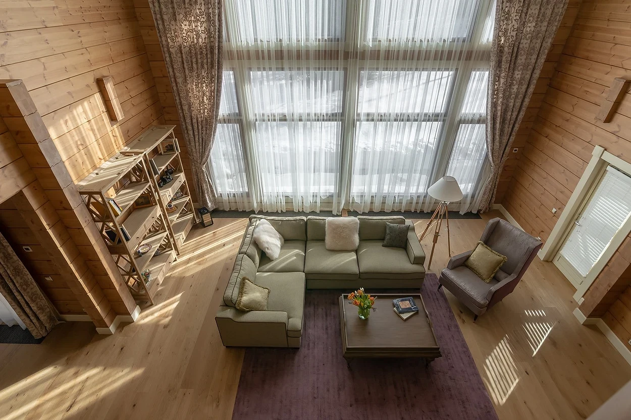 - Деревянные стены гостиной «дышат», то есть пропускают влагу как внутрь (при излишней сухости), так и наружу (когда внутри чересчур сыро). Поэтому в помещении не бывает слишком душно, а воздух остается свежим даже при закрытых дверях и большом количестве людей.