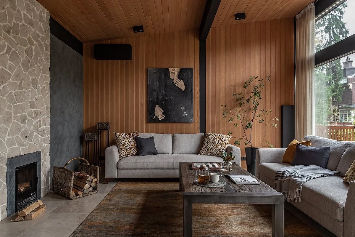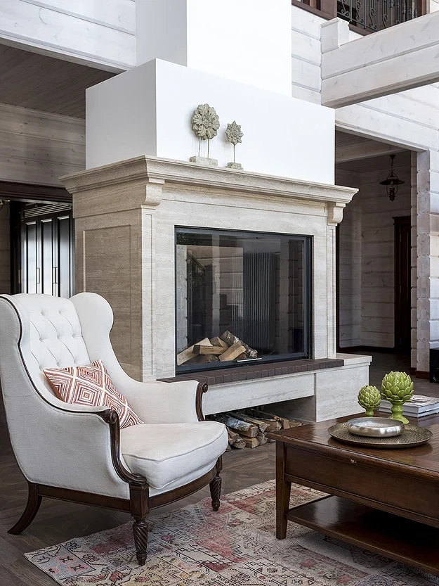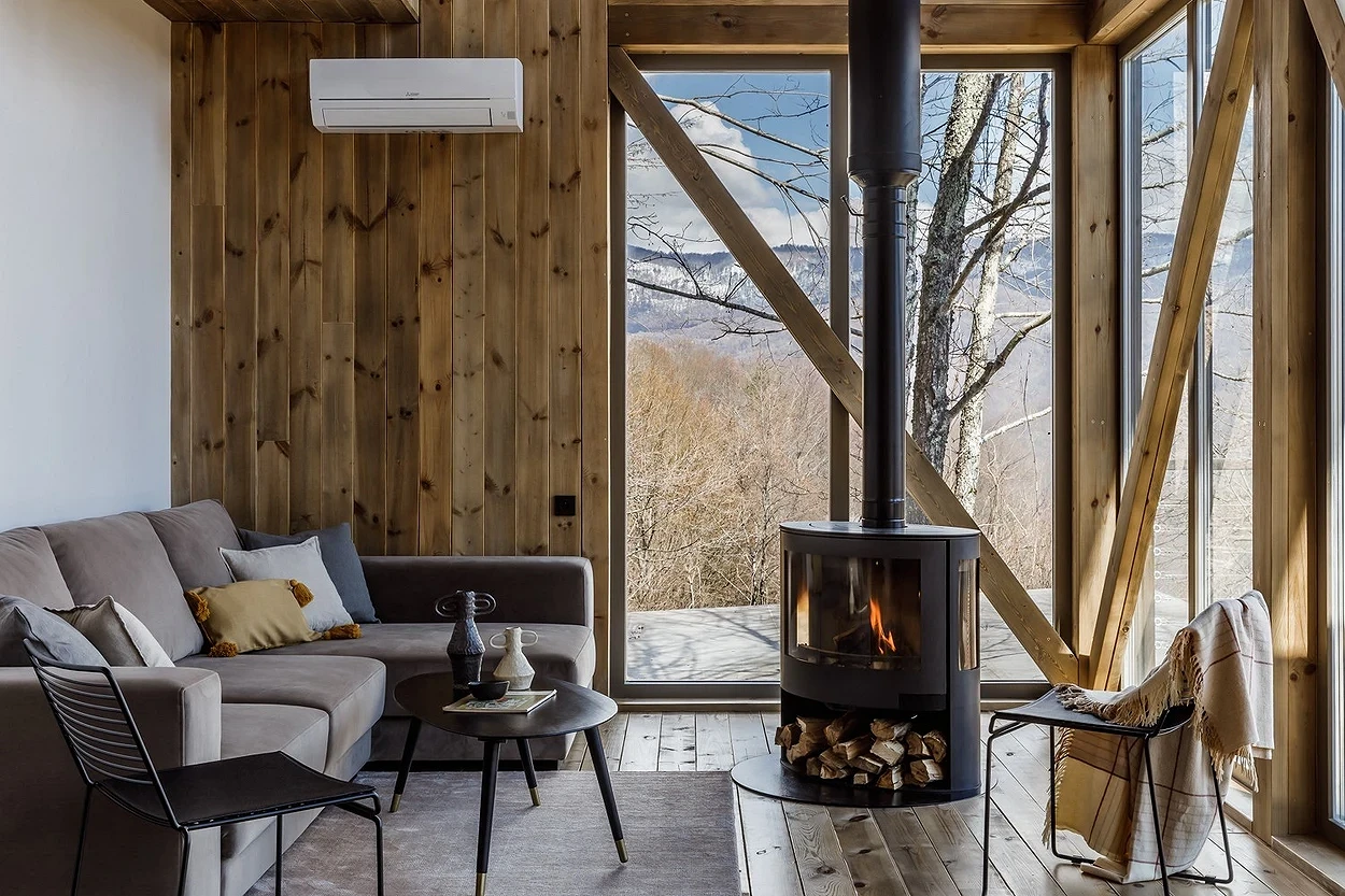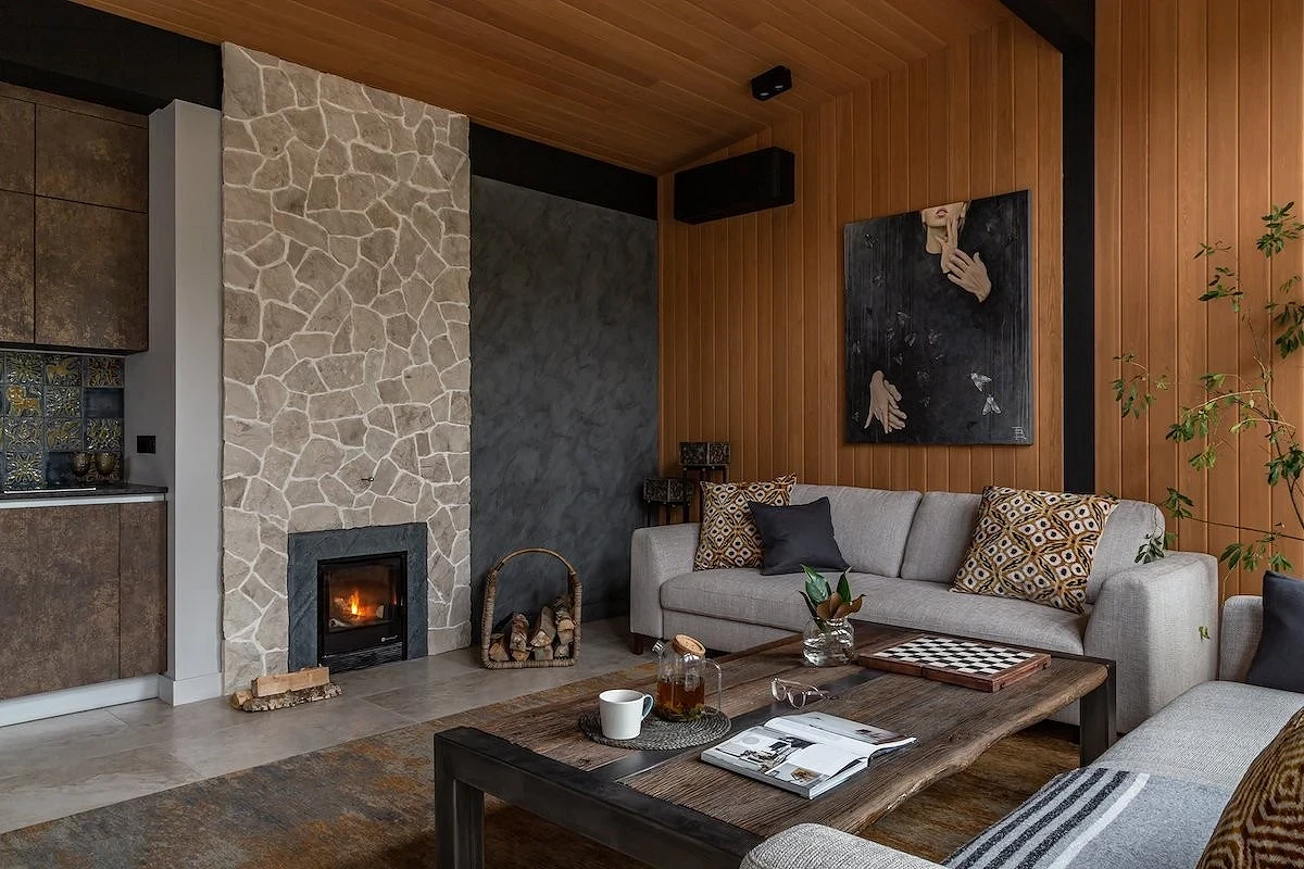 Очаг с потрескивающими в огне дровами идеально дополняет дизайн деревянной гостиной. Но несмотря на то, что камин буквально просится в интерьер, не всегда его использование оправдано. С одной стороны, он создает непередаваемый уют, помогает расслабиться и полноценно отдохнуть. С другой же стороны, в доме из дерева его установка требует дополнительных мер пожарной безопасности, ведь древесина легко воспламеняется. К тому же он занимает много места, поэтому поставить его в небольшом пространстве будет затруднительно.