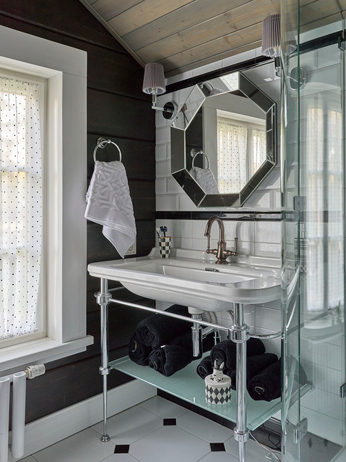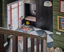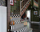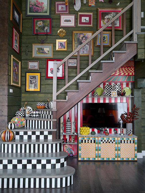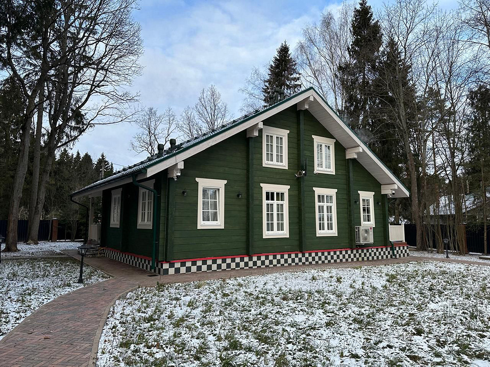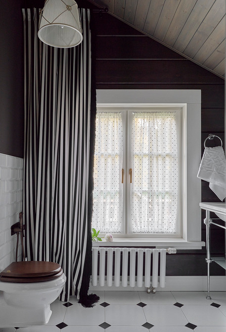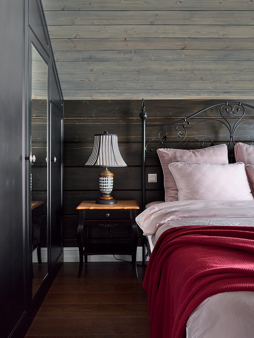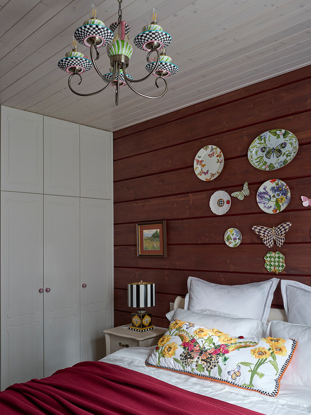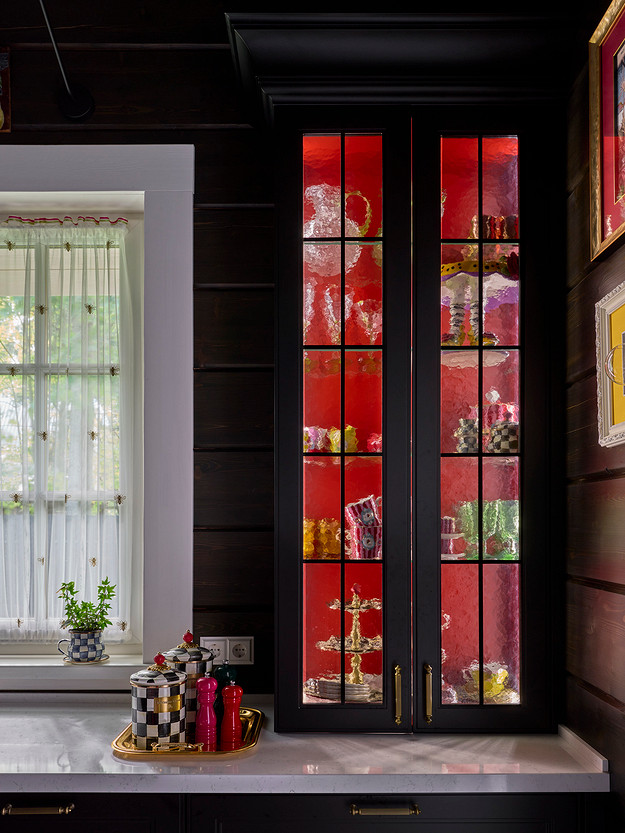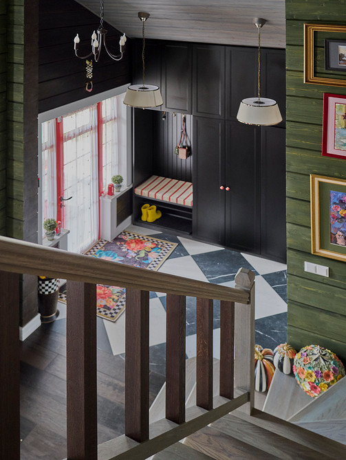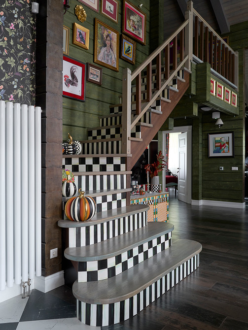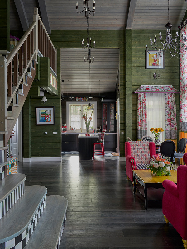 Экстерьер и интерьер этого дома выполнены в едином ключе. Их объединяет и материал — клееный брус, и смелый, выразительный подход к цветовому решению. Главные акценты — черно-белая шахматная клетка и элементы глубокого винно-красного цвета — проходят сквозной темой через все помещения, связывая фасад, интерьер и декор. Дом воспринимается как естественное продолжение лесного пейзажа: деревянные стены окрашены в сложные природные оттенки зеленого, коричневого и черного. Живости, непосредственности и загородного шика ему добавляют флористические орнаменты, а четкости, динамики и некоторой богемности — графичная клетка.