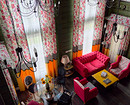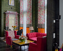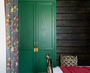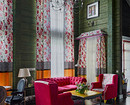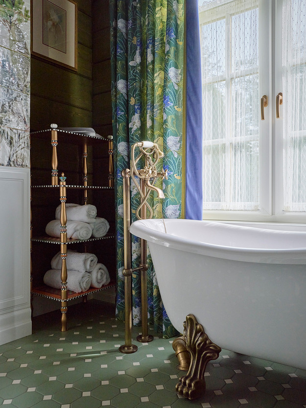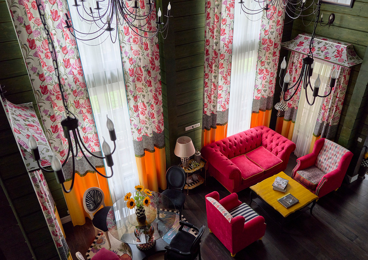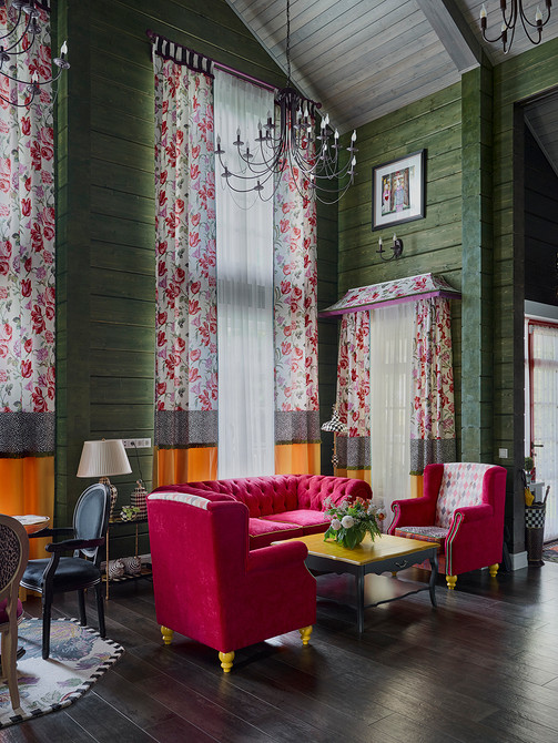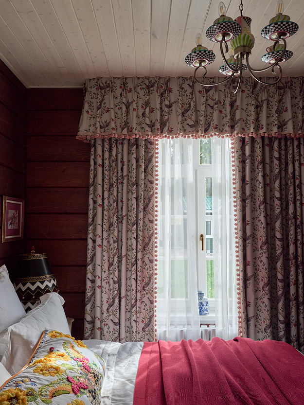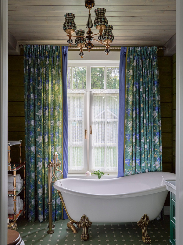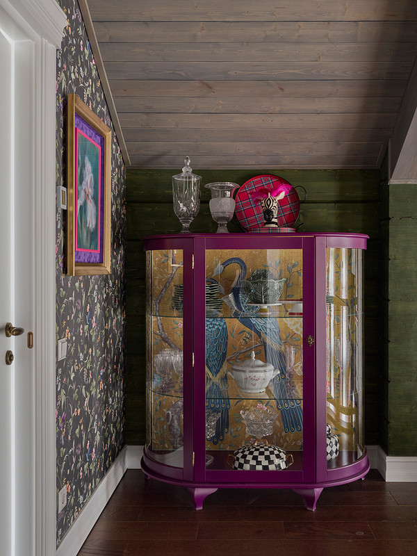 Флористические мотивы и насыщенные цвета — бирюзовый, малиновый, лаймовый, васильковый — отсылают к теме путешествий и колониальной истории, которая традиционно ассоциируется с английской визуальной культурой. Такая смелая, в чем-то даже эпатажная игра цвета, геометрии и флористики происходит в совершенно русском по ощущению пространстве деревянного дома.