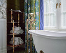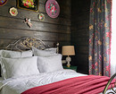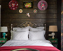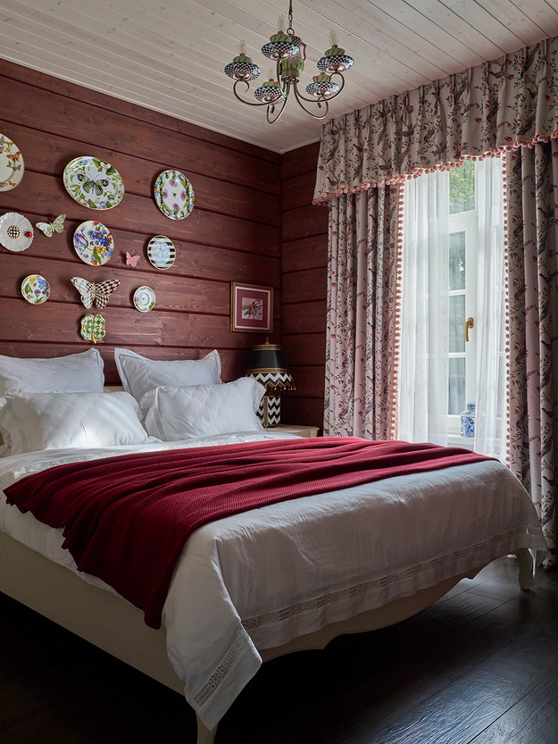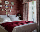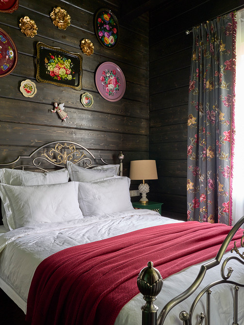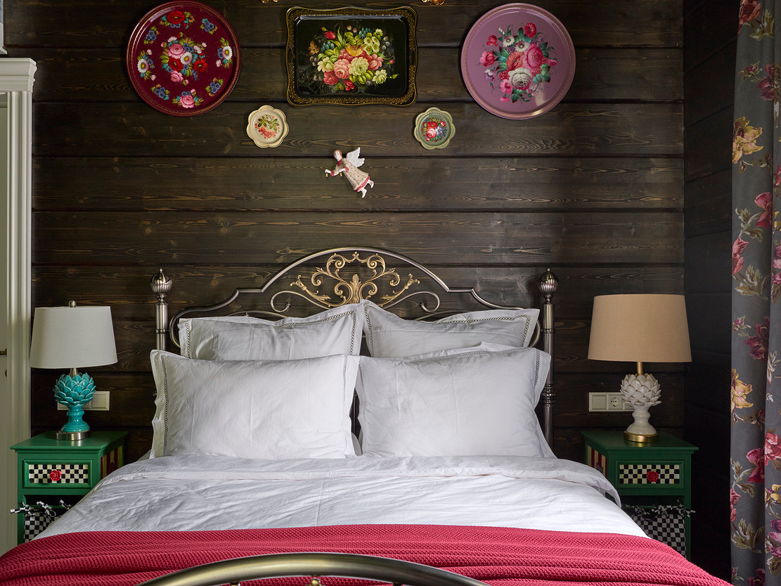 В мастер-спальне интерьер строится на типично английском сочетании приглушенно-красного и изумрудно-зеленого. Кровать с литыми металлическими спинкой и изножьем — красивый декоративный акцент в викторианском стиле. Неожиданно хороши в этом контексте оказались жостовские подносы в качестве украшения стены.