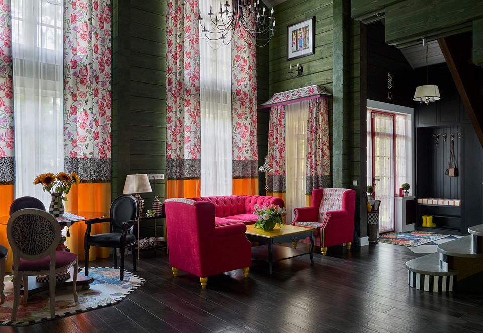 Загородный дом, сочетающий в своем облике элементы русской усадьбы и английского коттеджа, расположен в Сергиево-Посадском районе Московской области — одном из самых живописных и исторически значимых уголков Подмосковья. Хозяева — супружеская пара с дочерьми, двумя молодыми девушками, — постоянно проживают в городской квартире, а сюда приезжают на выходные. Именно это обстоятельство позволило оформить интерьер дома как яркое, нестандартное пространство: интерьер-впечатление, интерьер-праздник, призванный вдохновлять и дарить всей семье незабываемые эмоции.