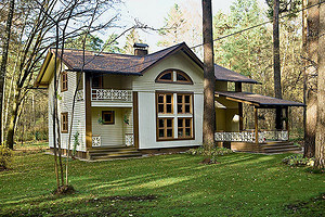 Неповторимая атмосфера дачного поселка, где прошли детство и юность, естественно, оказала свое влияние на принятое проектное решение. Хотелось тактично вписать новый дом в историческое и природное окружение. Он был задуман и реализован как постройка экономкласса. Мы стремились найти необходимый баланс между стоимостью строительства и архитектурным образом здания, что, по-моему, удалось. Из нескольких типов деревянных домов был выбран каркасный. Этот тип конструкции обеспечил меньший вес здания, что позволило сэкономить на фундаменте, к тому же каркасные сооружения, в отличие от срубов, не дают усадки, что весьма существенно сокращает срок строительства. Со всеми работами (бетонными и плотницкими) справились двое рабочих, за исключением, конечно, монтажа электропроводки, устройства водоснабжения и канализации