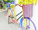 Самое простое — это покрасить один или два велосипеда в любимый цвет (можно и в разные цвета), установить сверху деревянные ящики, плетеные либо кованые корзинки и высадить туда цветы.