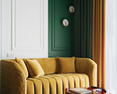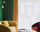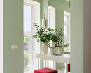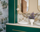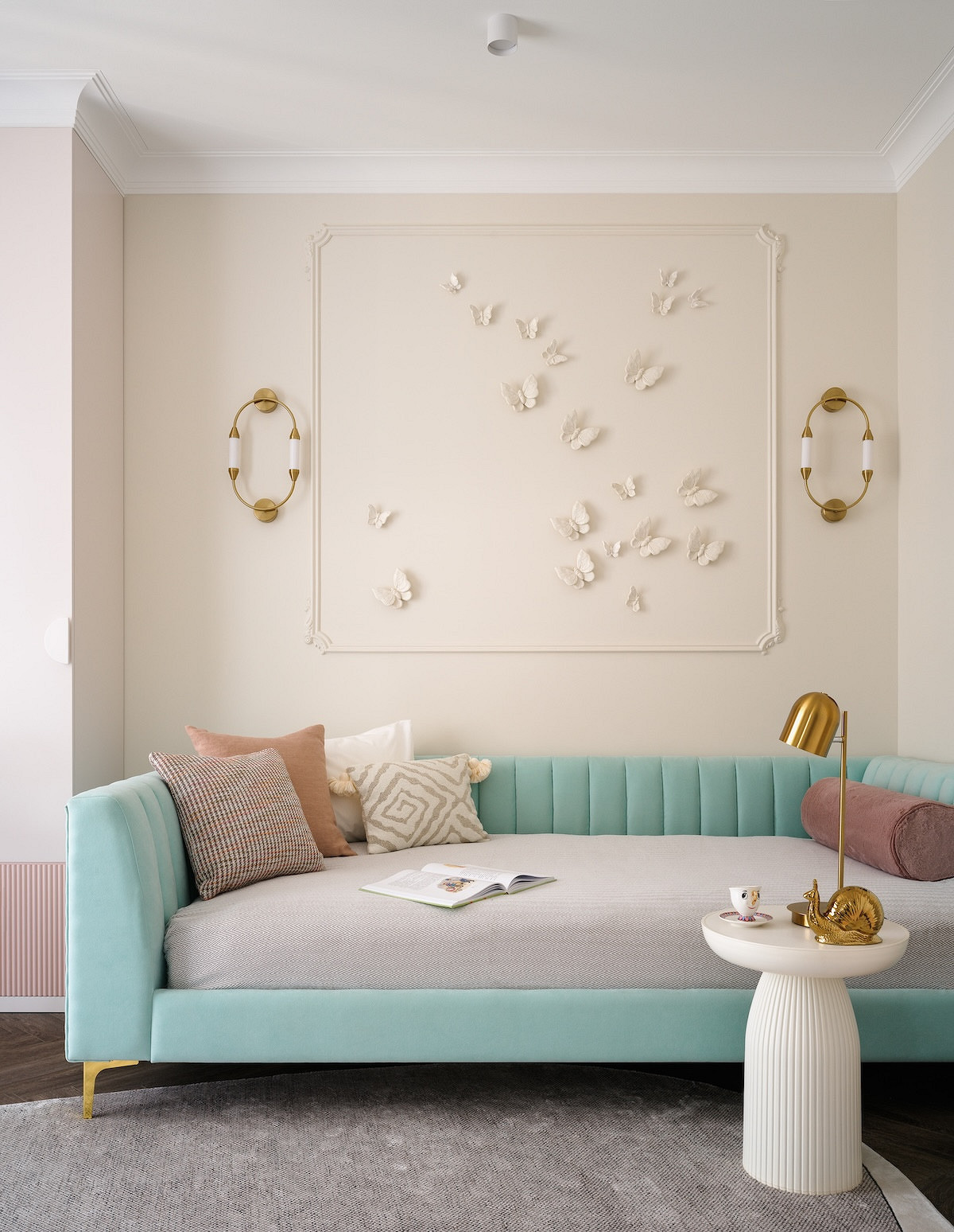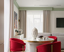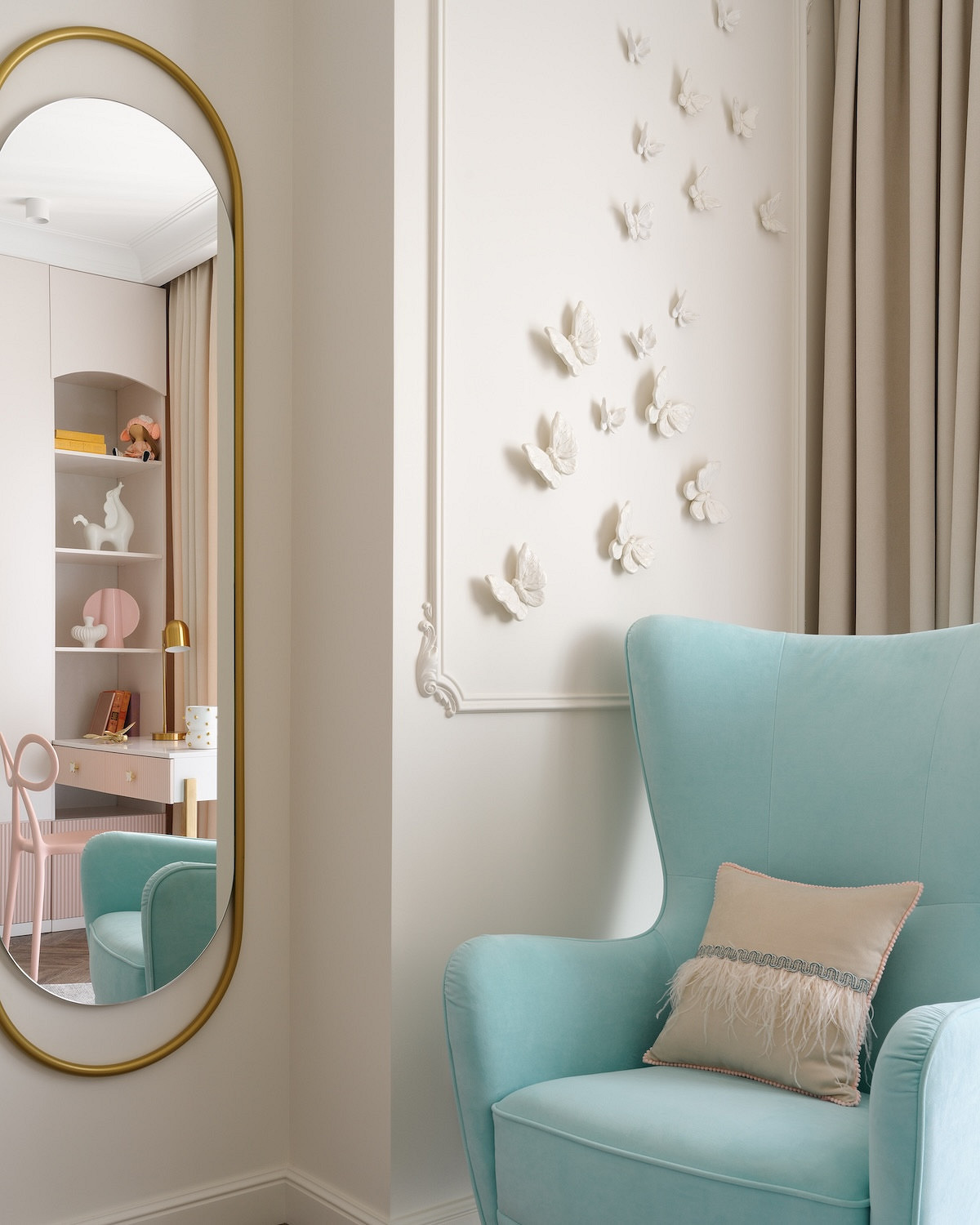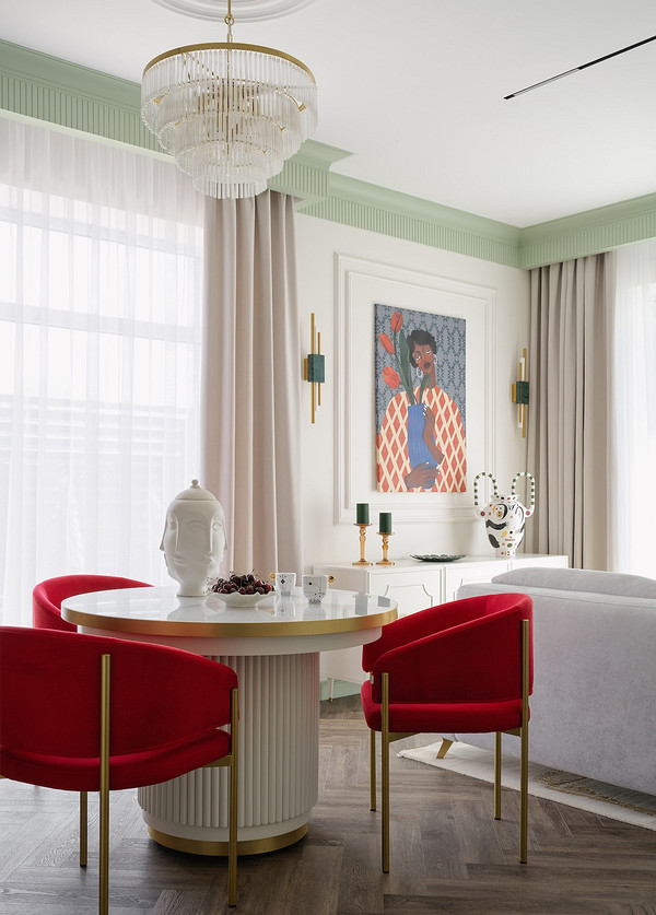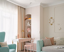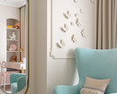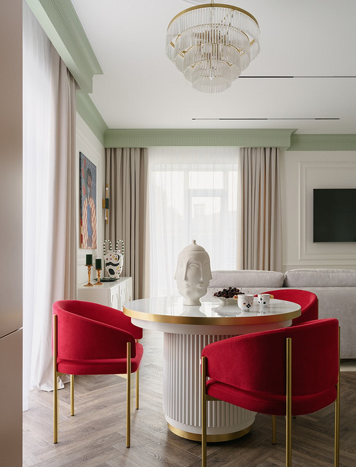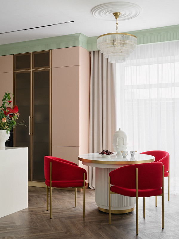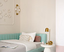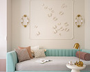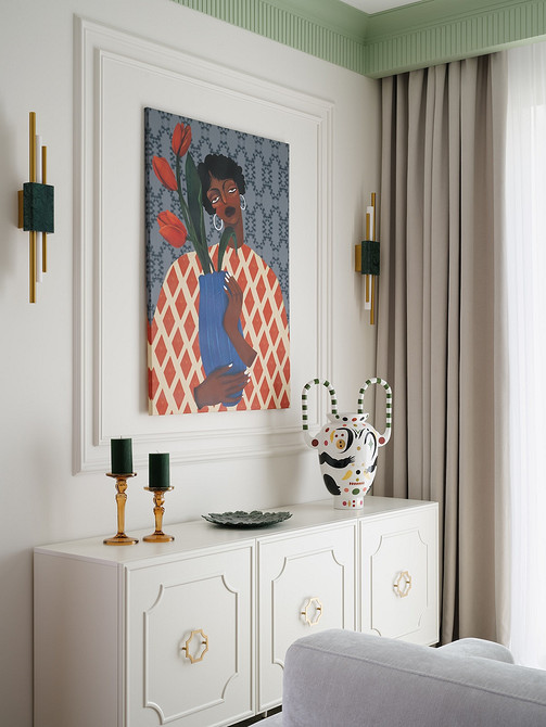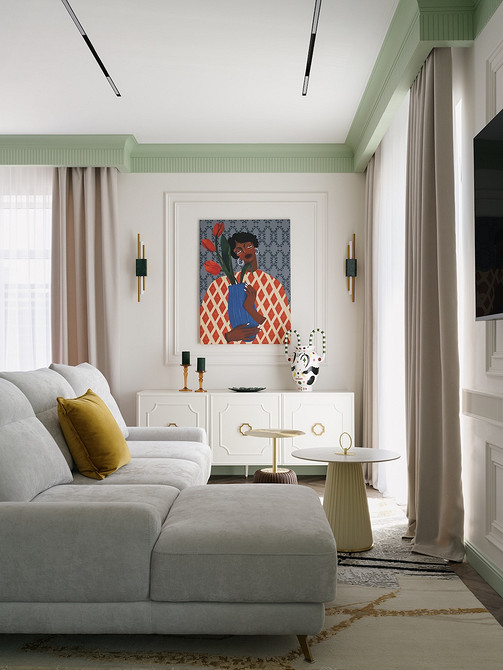 Хозяйка хотела видеть цвет в интерьере. Дизайнер выбрала пастельную гамму: основой стал бежевый, а акцентами — нежные оттенки зеленого. В мебели использовали и другие цвета: пастельный розовый, мятный, более насыщенный изумрудный цвет и даже достаточно яркий ягодный.