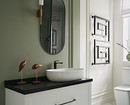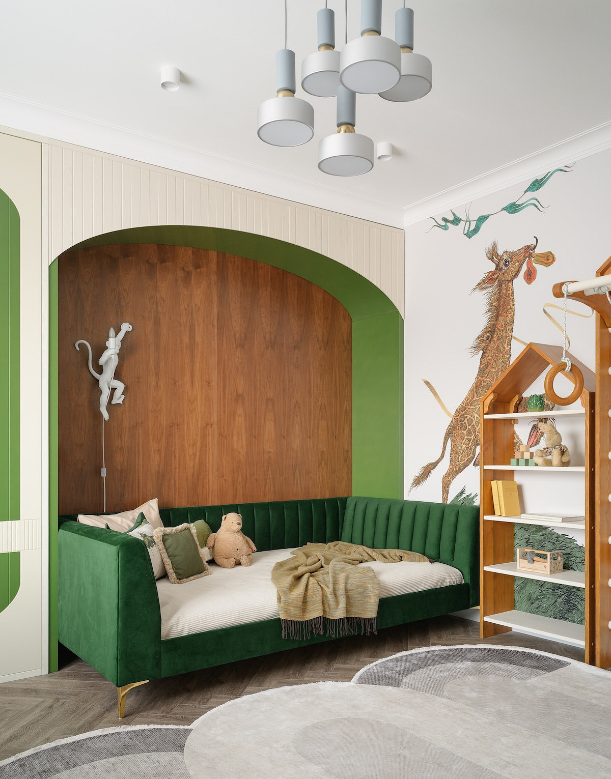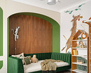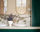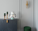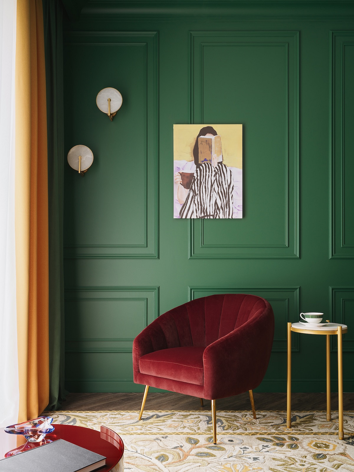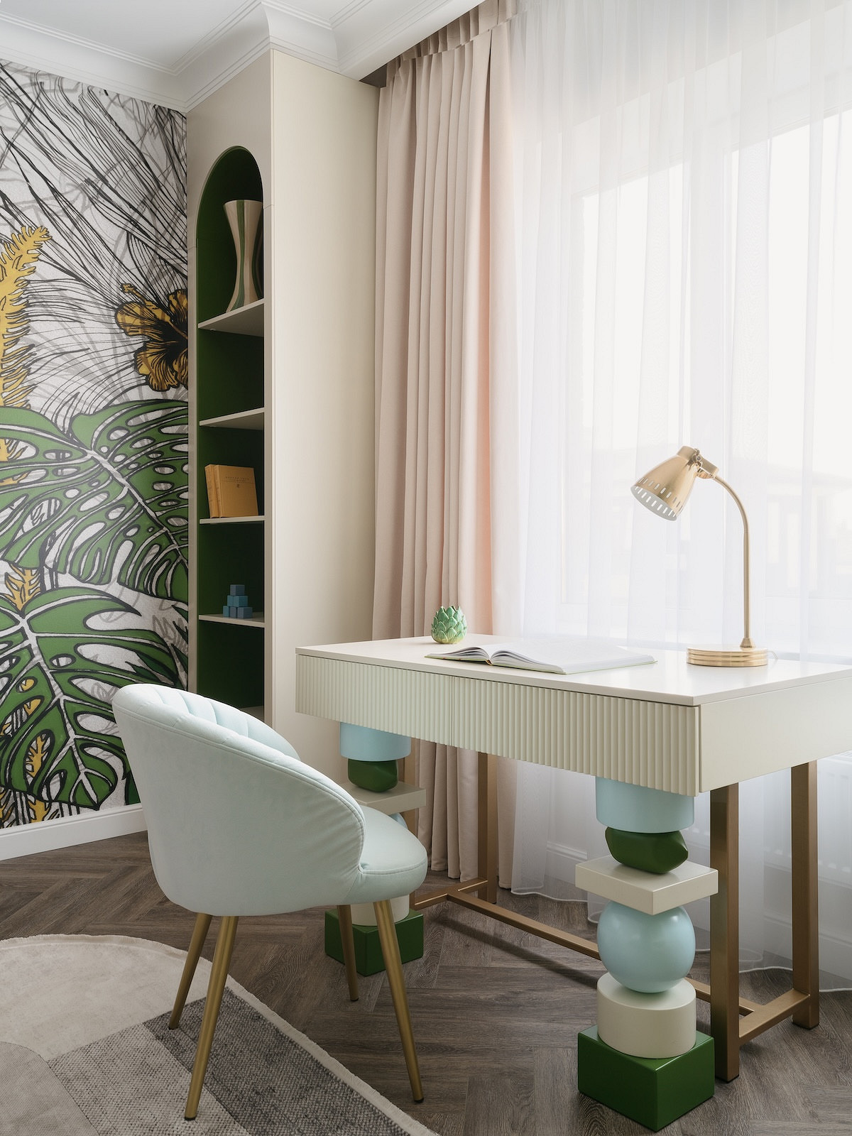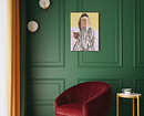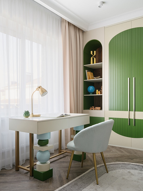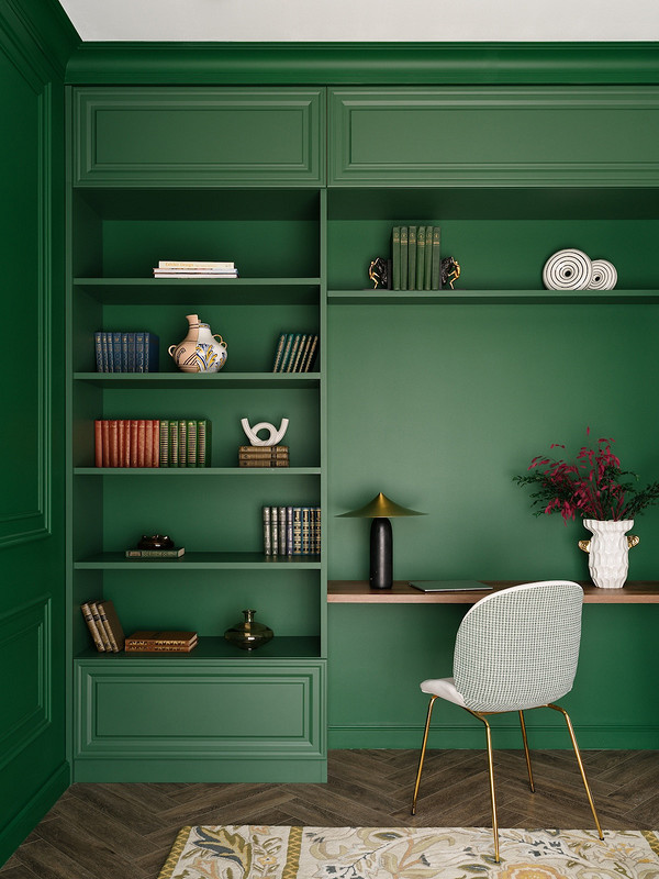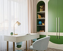 Кабинет хозяина — единственная комната, где много насыщенных оттенков. «Для кабинета хозяина я рискнула предложить глубокий зеленый оттенок, в который мы выкрасили и часть потолка. Этот цвет был выбран не случайно. Именно зеленый снимает напряжение, успокаивает, но не расслабляет. Он отвечает за логическое мышление, концентрацию и планирование. А не это ли нужно в рабочем кабинете», — комментирует дизайнер.