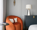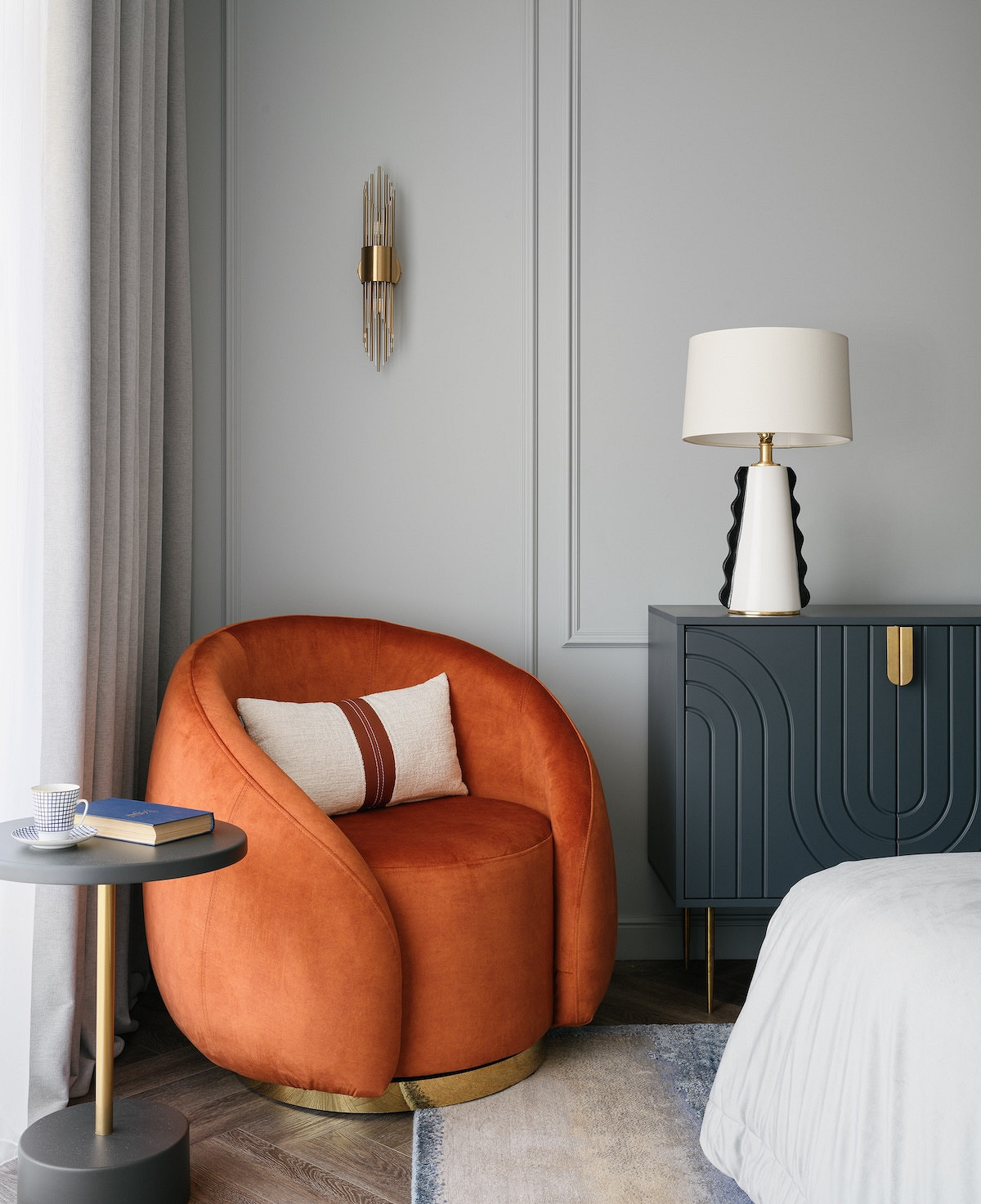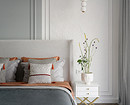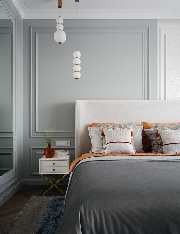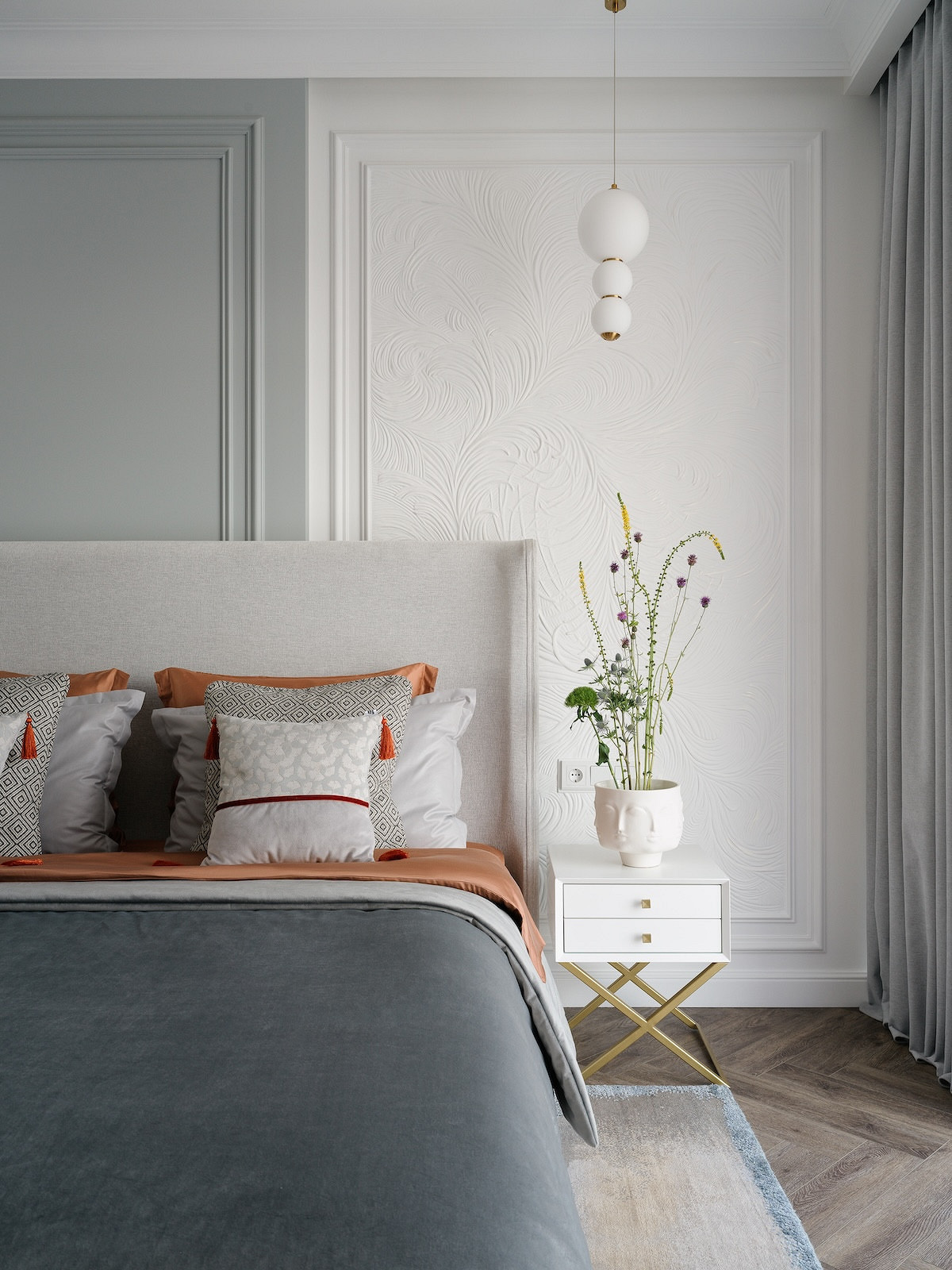 Спальня хозяев стала серой. «Больше всего обсуждений возникло именно по этой комнате. Требовалась атмосфера холодного туманного утра. Авторское гипсовое панно стало намеком на морозное кружево, а чистый серый оттенок стен наполнил комнату свежестью», — добавляет Екатерина.