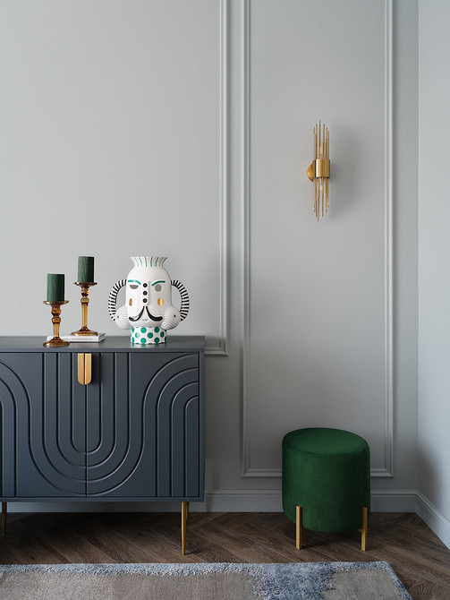 Так как выбрали стиль современная классика, придерживались и определенной отделки: на стенах краска, много лепнины (молдинги, плинтусы, карнизы, потолочные розетки и барельефы из гипса). На пол уложили кварцвинил под дерево.