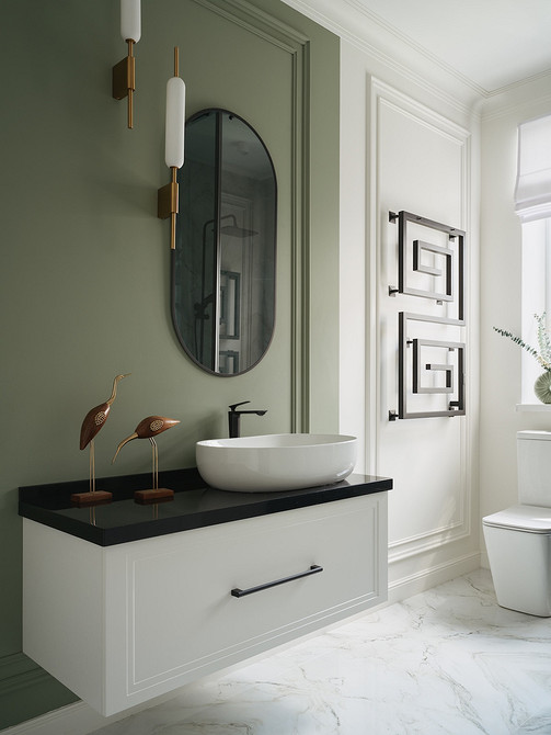 В санузле на первом этаже — тумба под раковину. На втором этаже решили сделать две раковины и длинную тумбу под ними, а также неглубокие шкафчики по бокам.