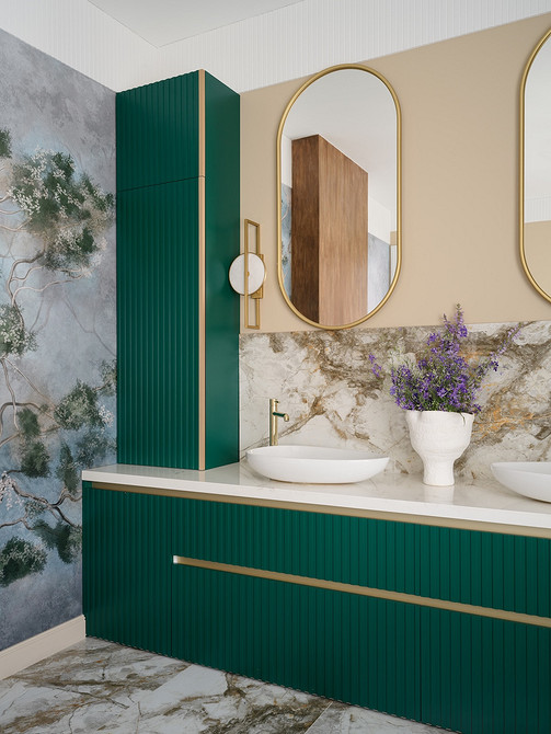 В санузлах, как и хотела хозяйка, комбинировали материалы. Керамогранит уложили только в тех зонах, куда может попасть вода — душевая в санузле на первом этаже, стена над раковинами в ванной на втором, и, конечно, на полу. Остальные стены покрасили, а в ванной использовали даже обои-панно с изображением деревьев.