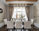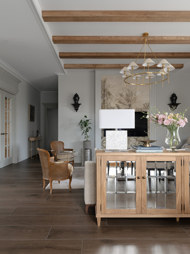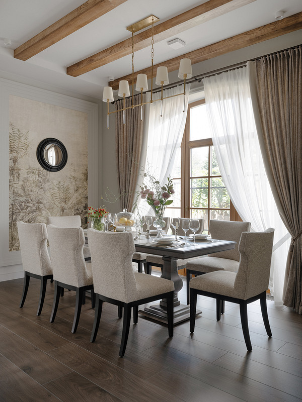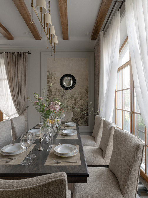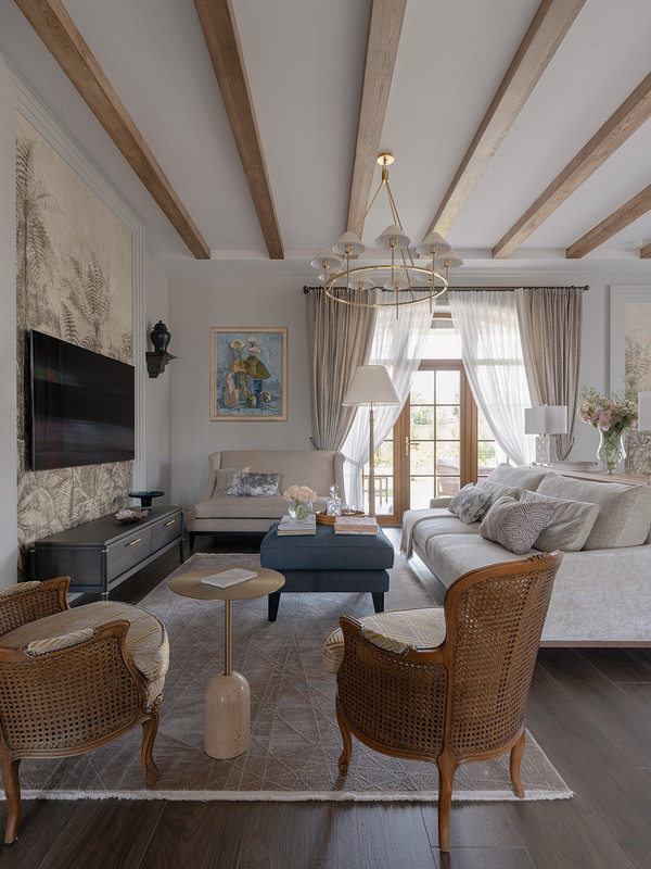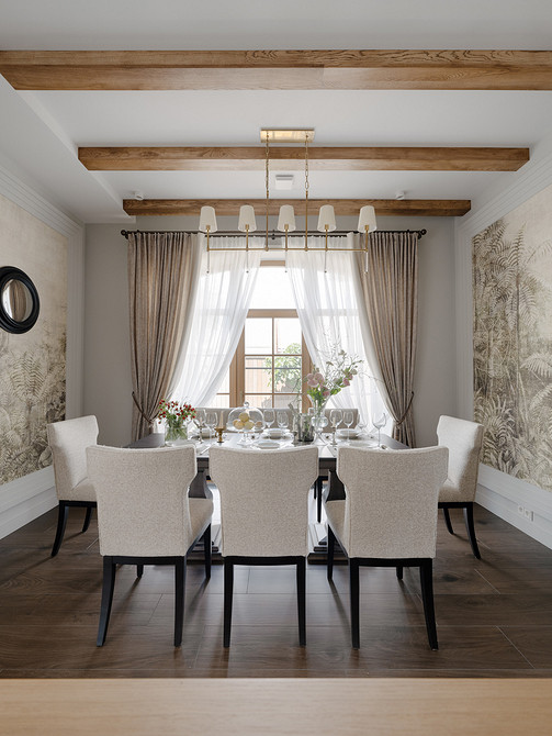 Деревянные балки на потолке дома — декоративные. Однако они имитируют несущие конструкции и расположены по правилам: в направлении, параллельном меньшей стороне пролета. Стены по бокам от столовой группы и за телевизором оклеены обоями с печатным рисунком. Он создан по индивидуальному проекту и нанесен на подложку из сизаля (волокон, получаемых из листьев растения рода агавы).