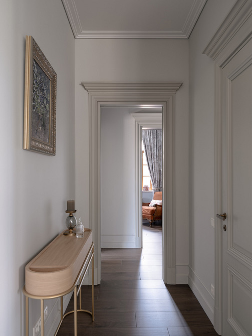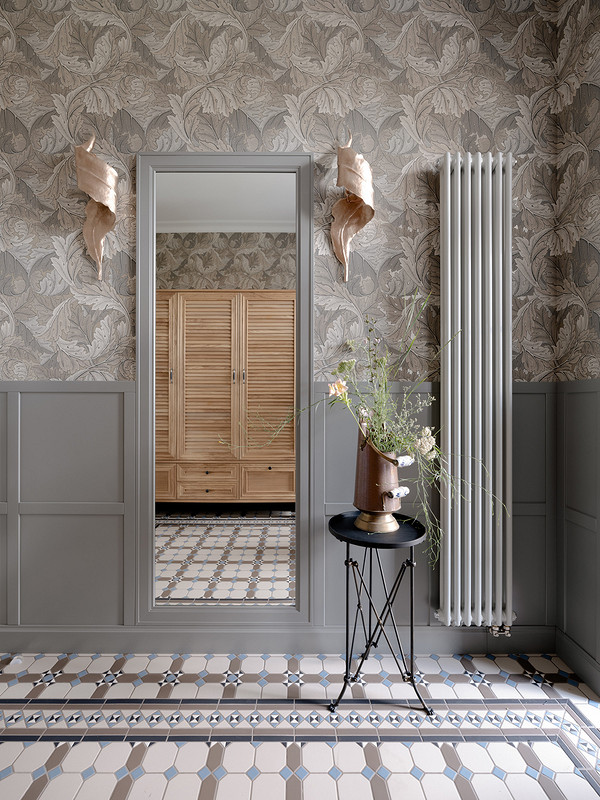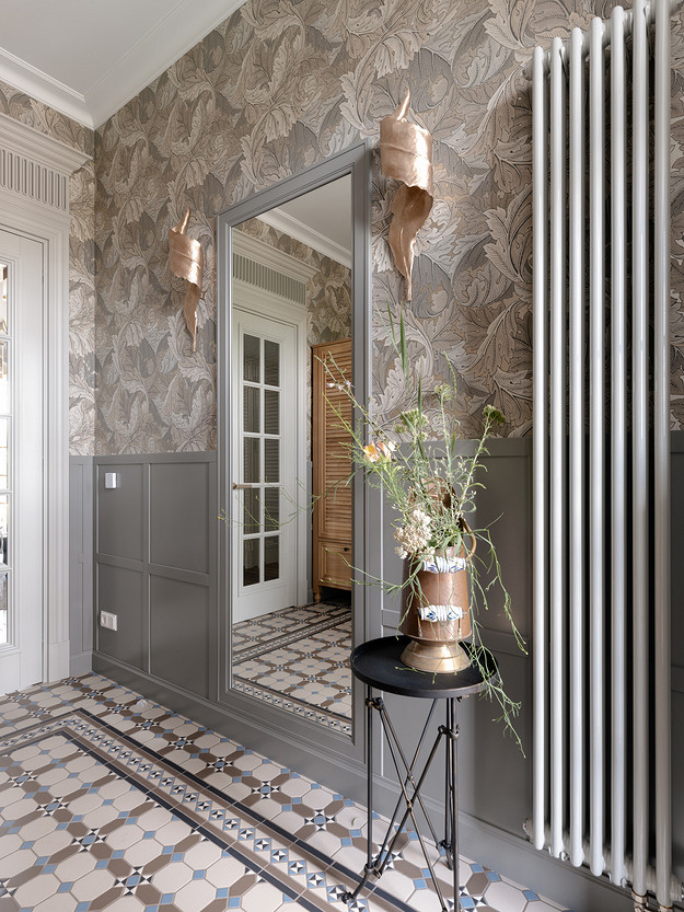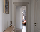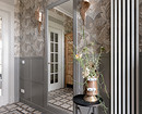 Нижнюю часть стен прихожей украшают панели из МДФ с гладким эмалевым покрытием, устойчивым к воздействию влаги и механическим повреждениям.