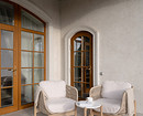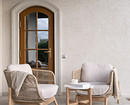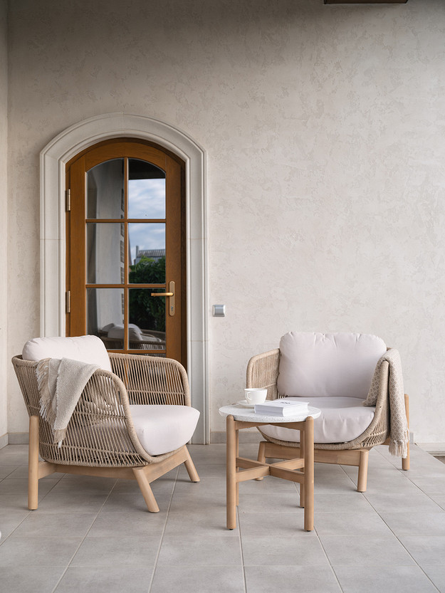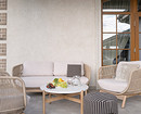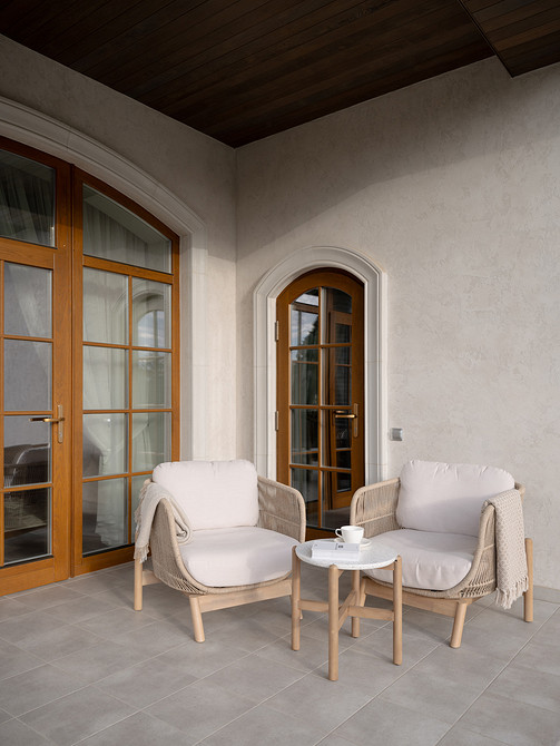 К дому примыкает большая терраса с комфортной зоной отдыха, на которую можно выйти из столовой-гостиной и мастер-спальни. От дождя и ярких солнечных лучей это открытое пространство защищает крыша. С наступлением темноты продлить уютные посиделки на креслах и мягком диване помогают потолочные светильники.