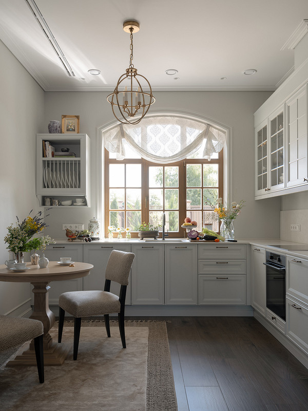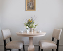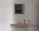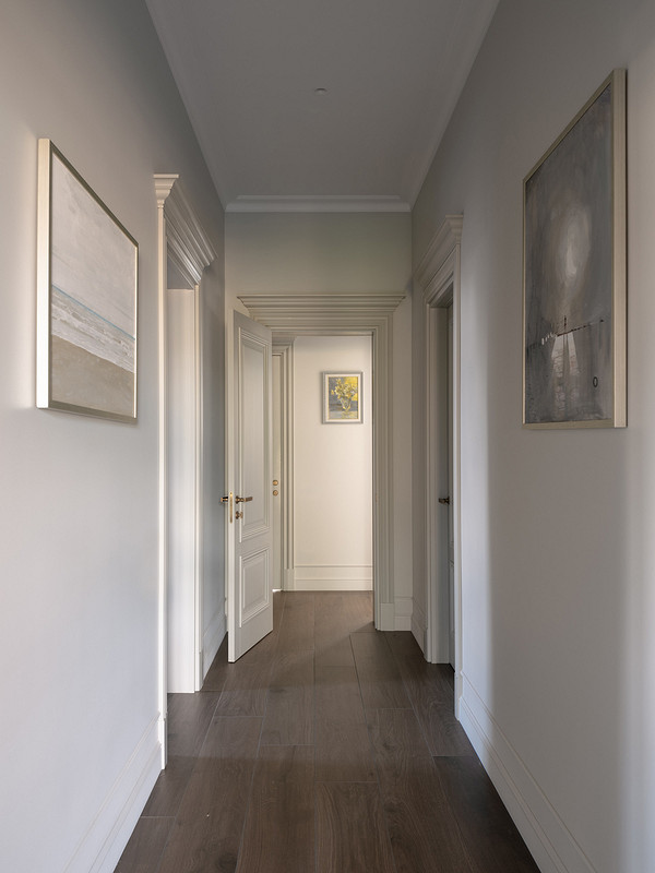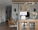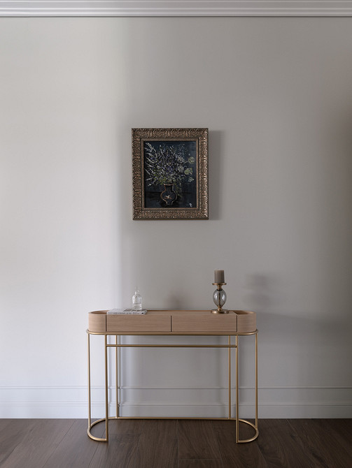 Интерьерную палитру формирует сдержанное сочетание белого и бежевого цветов, а также натуральных оттенков дерева. Интерьер дома получился современным, чему способствуют лаконичные, но выразительные полотна молодых художников, и сохраняющим классическую элегантность.