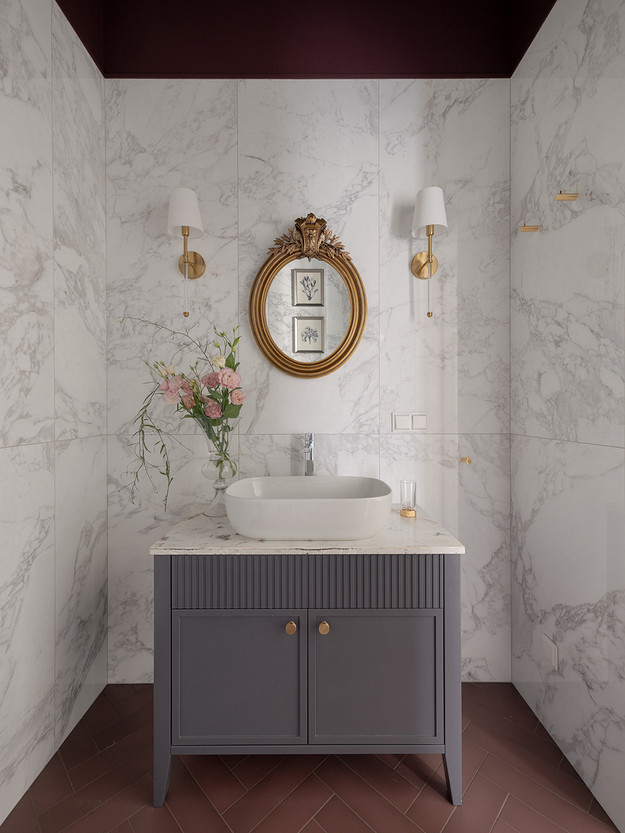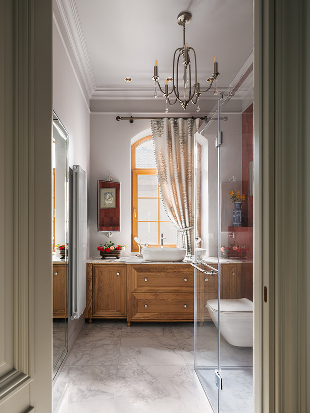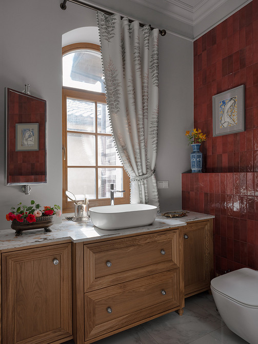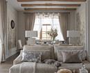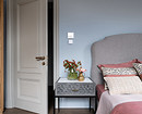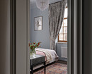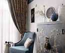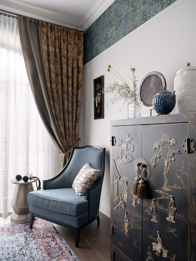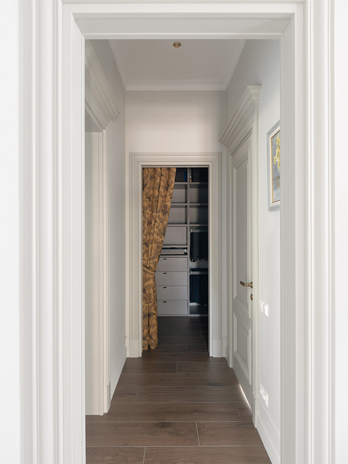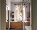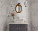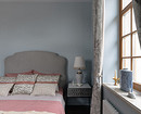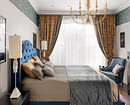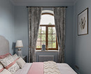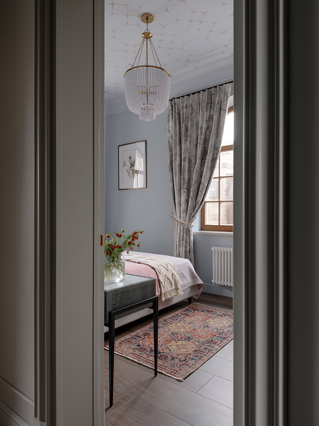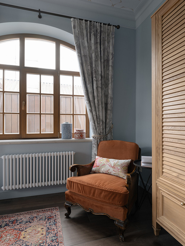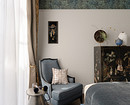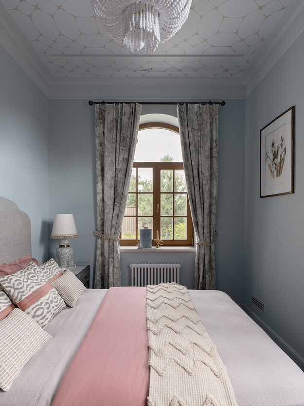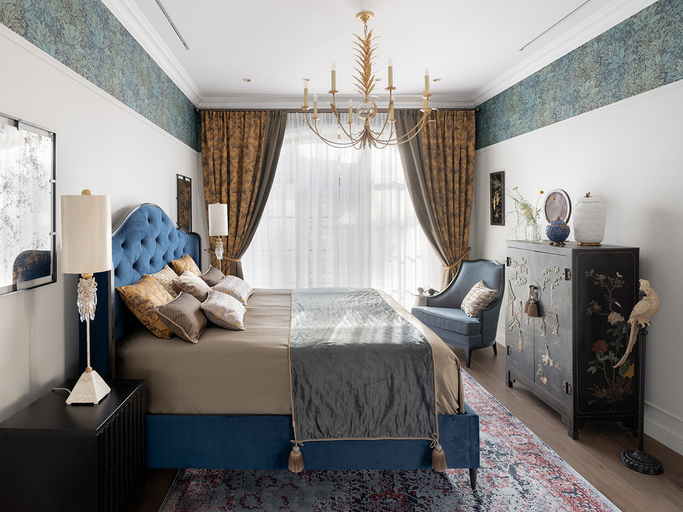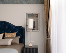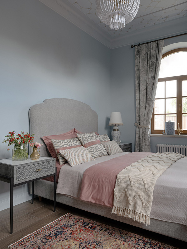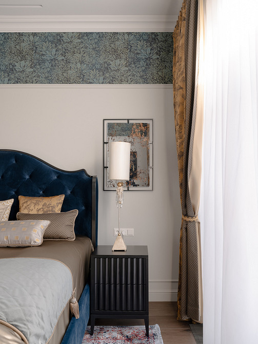 Важную роль в оформлении мастер-спальни играет текстиль. Здесь много подушек, бархатное изголовье кровати, мягкий ковер на полу, портьеры и тюль — все это создает мягкое, обволакивающее настроение и располагает к отдыху. Стены декорированы обоями и краской. Свет от плафонов прикроватных светильников отражают состаренные зеркала.
