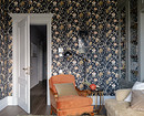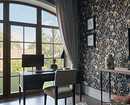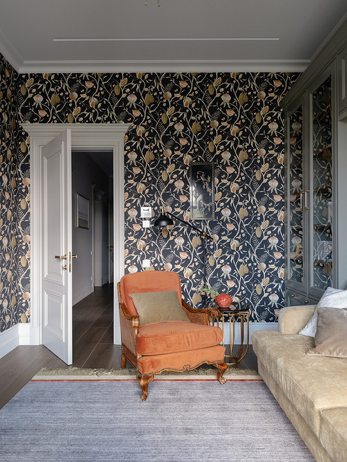 Стены кабинета и частично входной зоны оформлены флизелиновыми обоями. Они изготовлены из прочного нетканого материала на основе целлюлозы, который обладает высокой стабильностью размеров. В отличие от бумажных обоев флизелиновые при нанесении клея не растягиваются, а при его высыхании не дают усадки. Их полотна прочны на разрыв и могут сдерживать образование микротрещин на основаниях стен. Некоторые виды флизелиновых обоев имеют важное эксплуатационное качество — влагостойкость. Возможность влажных уборок обеспечивает нанесенный на производстве поверхностный защитный слой. Благодаря ему полотна флизелина можно протирать мягкой влажной губкой, а при наличии соответствующих пиктограмм на этикетке рулона мыть с применением моющих средств.
