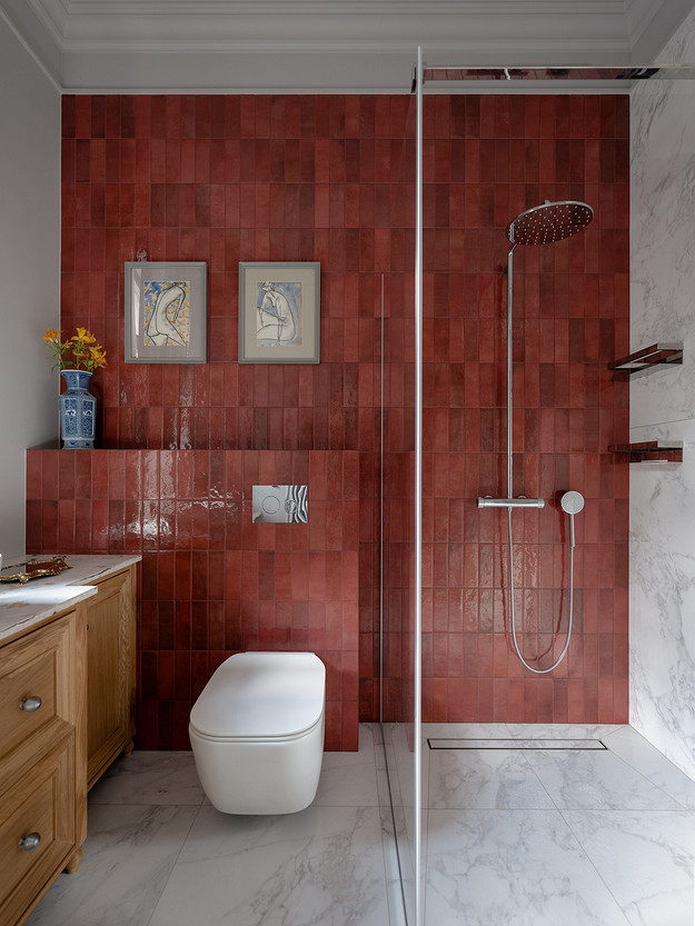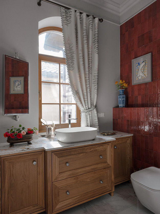 Сложные инженерно-гидрогеологические условия потребовали комбинации ленточного и плитного фундаментов, что обеспечило высокую прочность, надежность и устойчивость конструкции дома. Внешние стены возвели из классического керамического кирпича, перегородки — из кирпича забутовочного. Для него допустимы шероховатости, сколы и незначительные отклонения в геометрии, что даже усиливает сцепку со штукатурным раствором при дальнейшей финишной отделке.