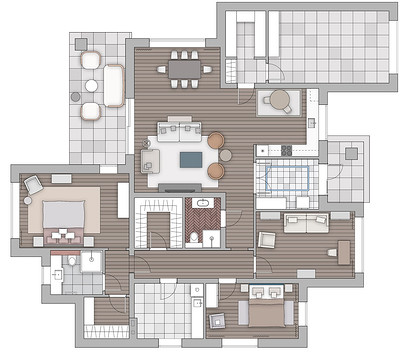 Основные пожелания касались планировочной структуры. Например, одним из обязательных условий был выход из спальни на террасу. Увлечение хозяйки литературой, театром, живописью трансформировалось в желание создать «литературную гостиную», где можно собраться с друзьями и обсудить прочитанное, фильмы, жизненные истории. Поэтому логичное планировочное решение — объединенная зона приема гостей и изолированная мастер-спальня. Кроме того, в дом требовалось интегрировать гараж. Много внимания уделялось деталям создания безбарьерной среды, среди которых, например, отсутствие ступенек. Когда мечта обрела вполне конкретные формы, дизайнер обратилась к знакомому архитектору. Он сделал расчеты и представил строительные чертежи.