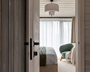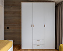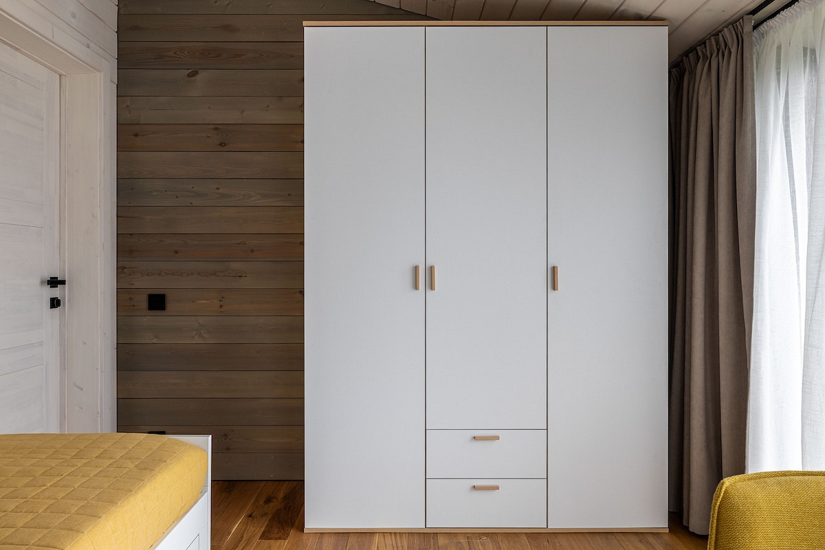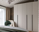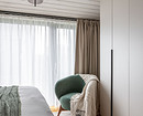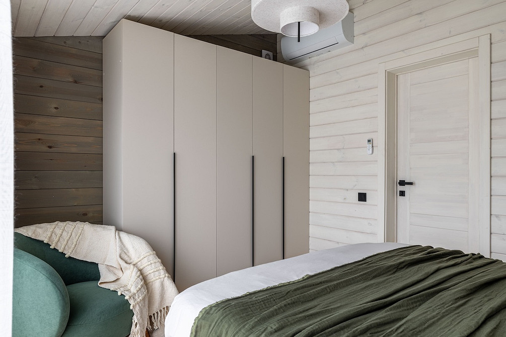 Две комнаты оформили как спальни — одна предназначена для семейной пары, вторая может стать детской, кабинетом или гостевой комнатой. В спальне разместили двуспальную кровать, напротив поставили большой шкаф для одежды. Его купили готовым. У окна также поставили кресло.