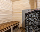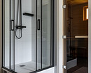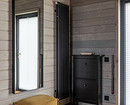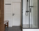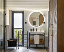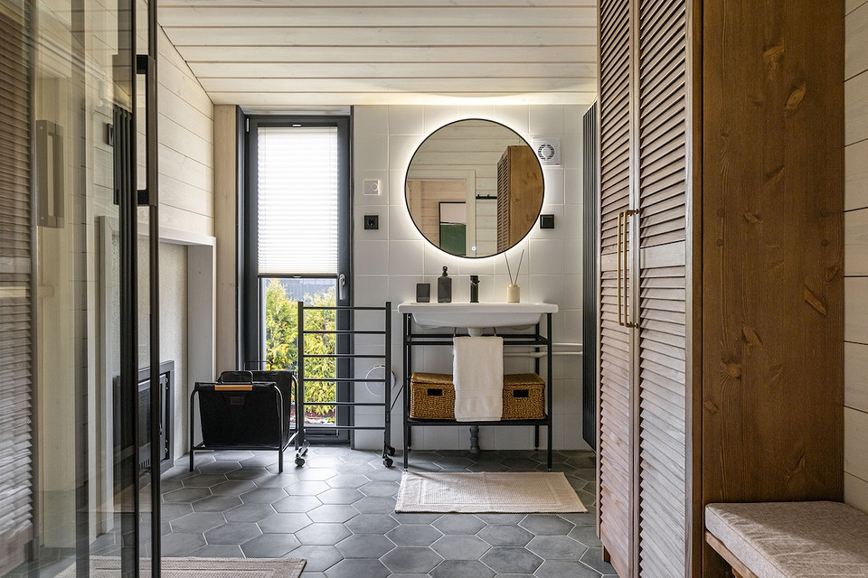 В ванной комнате — шкаф с жалюзийными фасадами, его поставили, чтобы спрятать коммуникации и предусмотреть хранение нужных хозяйственных вещей.