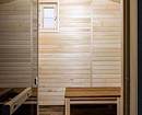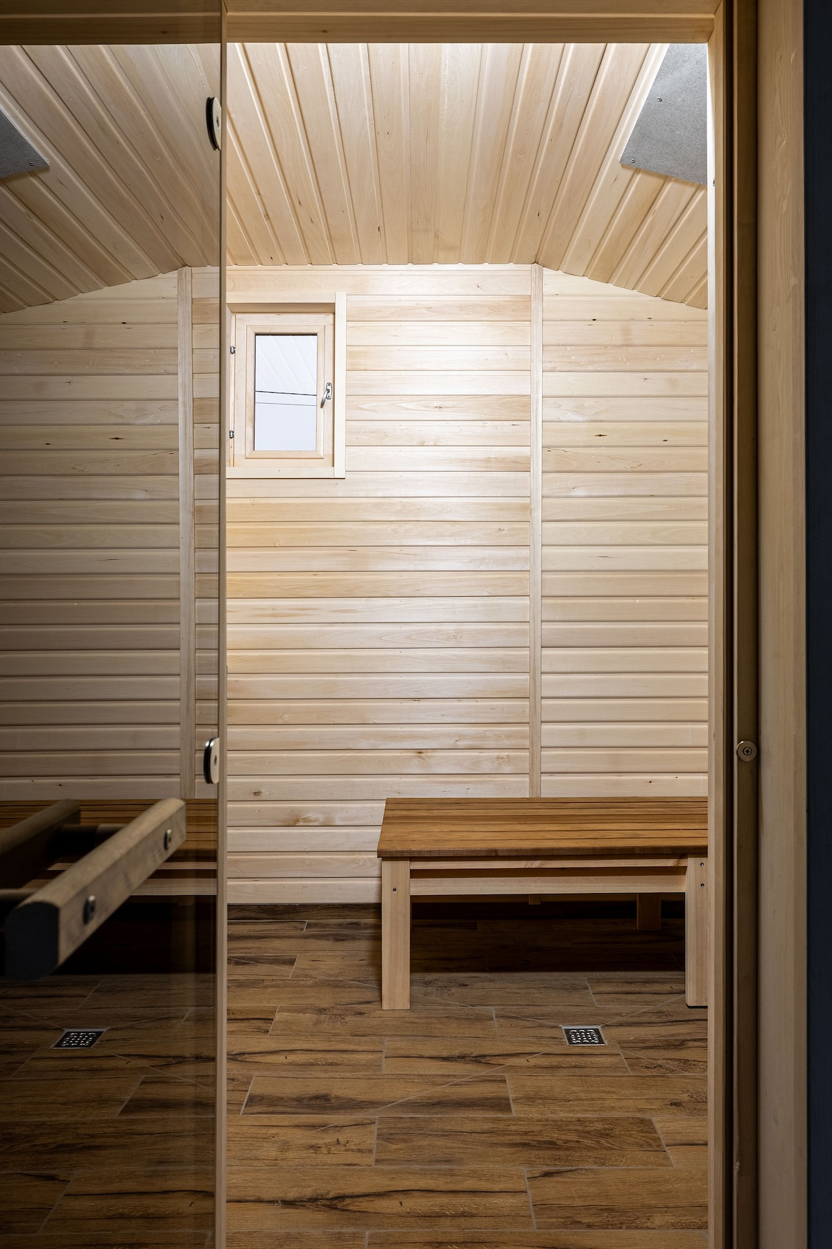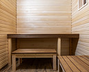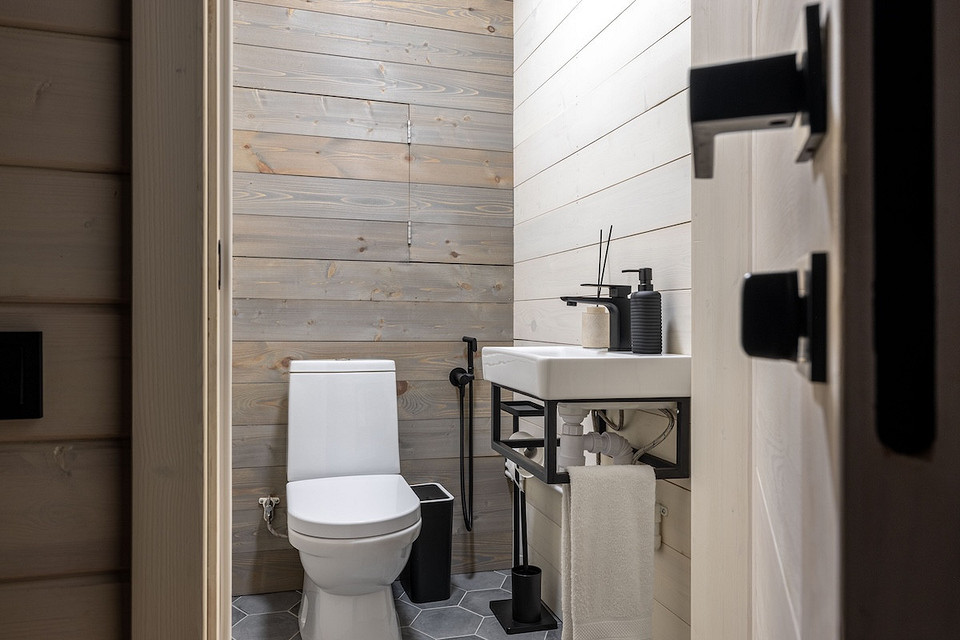 В туалетах тоже деревянные стены, плитка уложена только на пол.