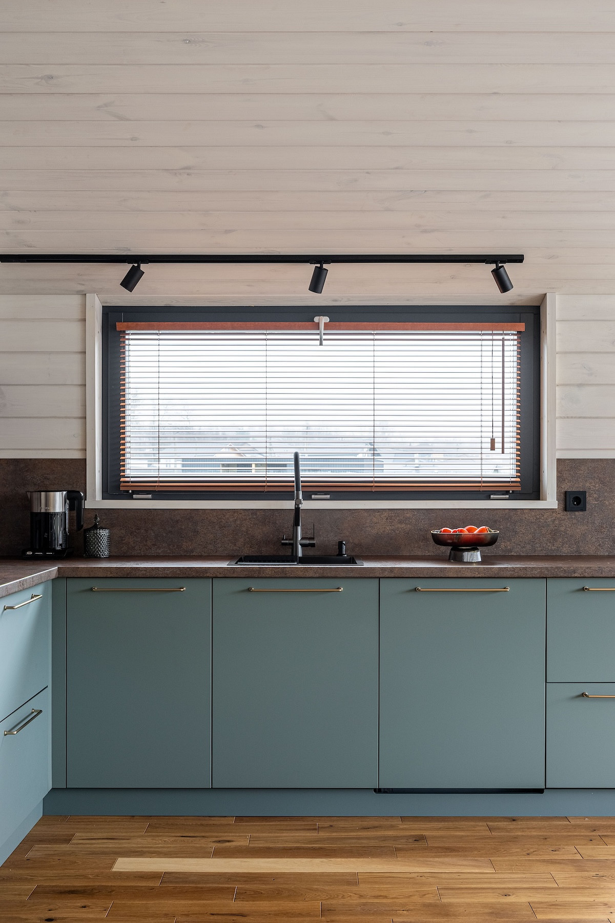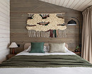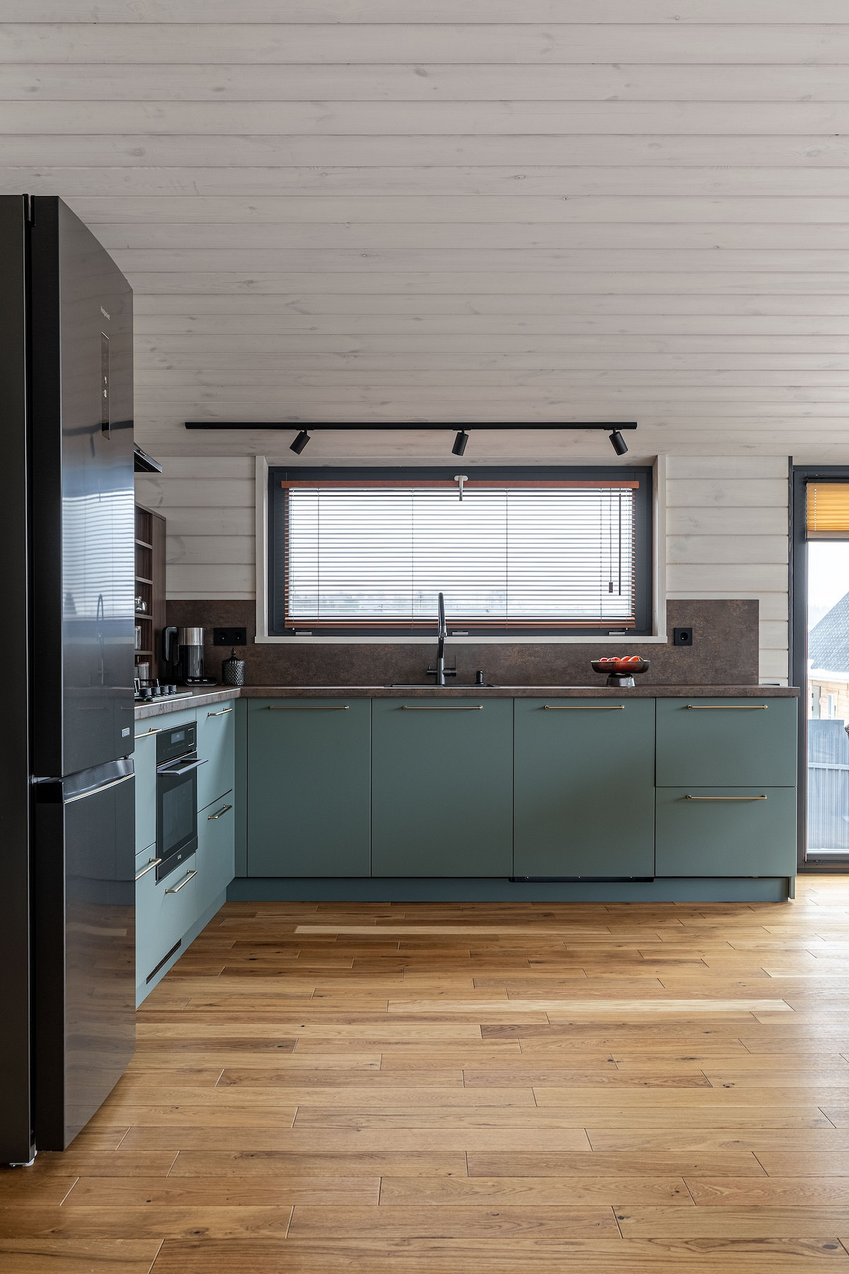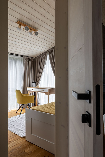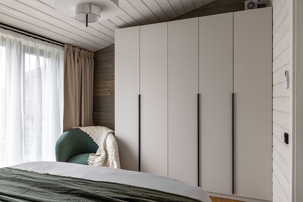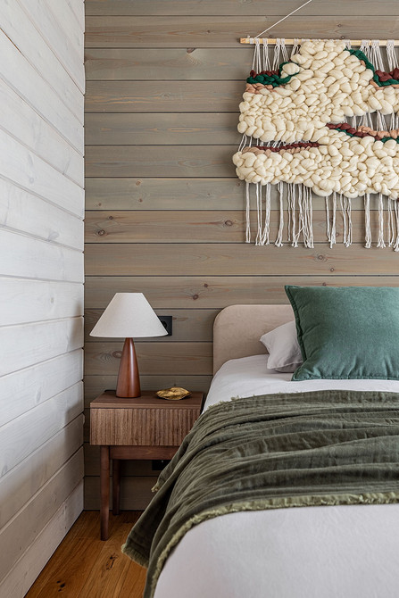 Стиль этого проекта — эклектика из элементов сканди, mid-century и винтажа. Натуральное дерево и нейтральная палитра красок в отделке задали хорошую базу, поэтому мебель и детали интерьера выполнены в теплых акцентных цветах: глубокий зеленый, темно-коричневый, терракотовый и охристый. В спальнях отдали предпочтение нейтральной и спокойной серо-бежевой палитре с небольшими акцентами цвета в текстиле, чтобы передать атмосферу отдыха и расслабления. В силу архитектуры дома и обилия панорамного остекления задача по декорированию окон стояла нетривиальная. Самую большую панораму в кухне-гостиной я решила оставить без штор, так как она открывает вид на террасу, вглубь участка и на природу — это одно из главных преимуществ дома, его важно было сохранить. В то же время боковые окна дома выходят на соседние участки, поэтому их решено было обыграть жалюзи и плиссе, пропускающими свет, для создания приватности. В спальнях окна оформлены легким тюлем с натуральной фактурой льна и портьерами из фактурной плотной ткани блэкаут, сшитыми на заказ, в том числе на косой проем.