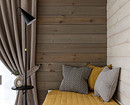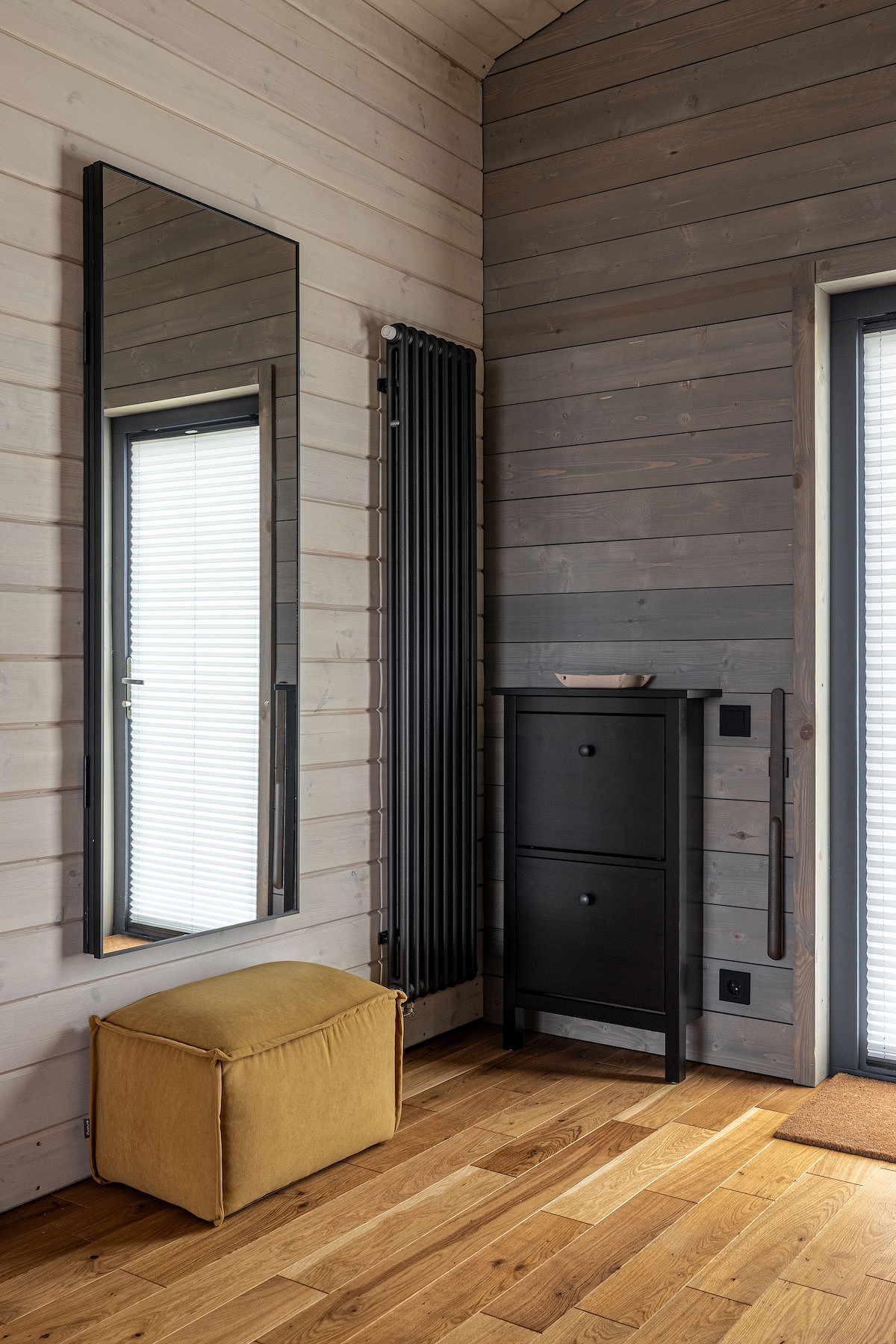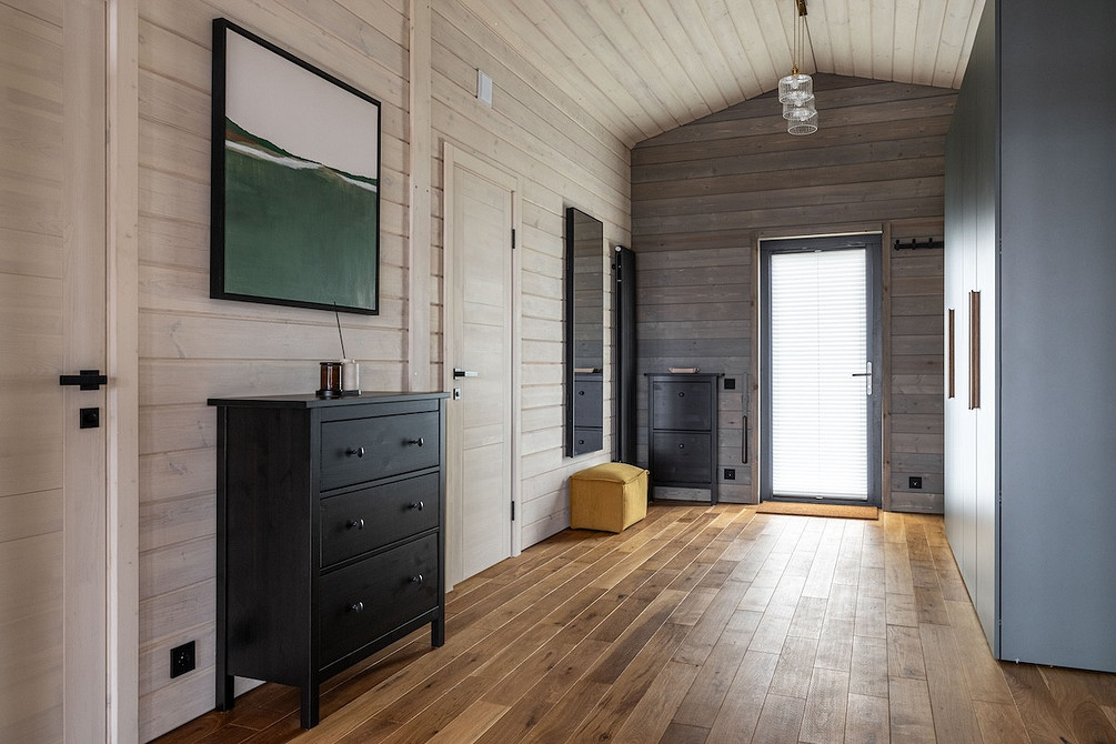 Застройщик сдал дом с готовой отделкой: стены и потолок отделаны деревом и тонированы в светлые оттенки, полы тоже оформлены деревянными досками.