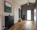 Так, в прихожей расположили шкаф (его выполнили на заказ), в котором спрятана стиральная машина. Прямо у двери — обувница и крючки для повседневной верхней одежды, дальше по коридору — комод.