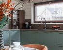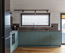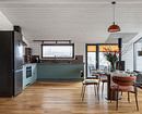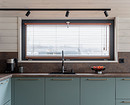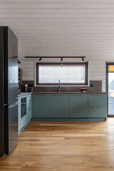 Кухонный гарнитур изготовили на заказ. От верхних шкафов отказались, чтобы сохранить ощущение свободного пространства, к тому же расположение верхних шкафов ограничивали скошенный потолок и окно. В нижних шкафах встроены духовой шкаф и посудомоечная машина. Холодильник — отдельно стоящий. Дополнительно для посуды предусмотрен шкаф-буфет у входа в кухню-гостиную.