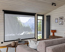 Гостиная зона представлена угловым диваном, журнальным столиком и тумбой. Напротив дивана размещен проектор, поэтому тумба стоит сбоку.