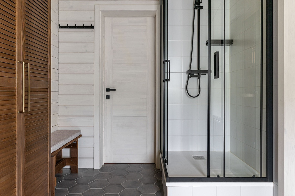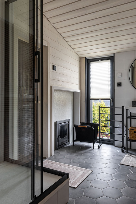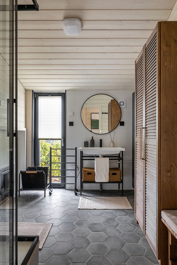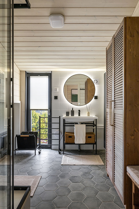 В просторной ванной комнате квадратной белой плиткой отделаны только стены душевой и за раковиной. На пол уложена плитка в форме шестиугольников под серый бетон.