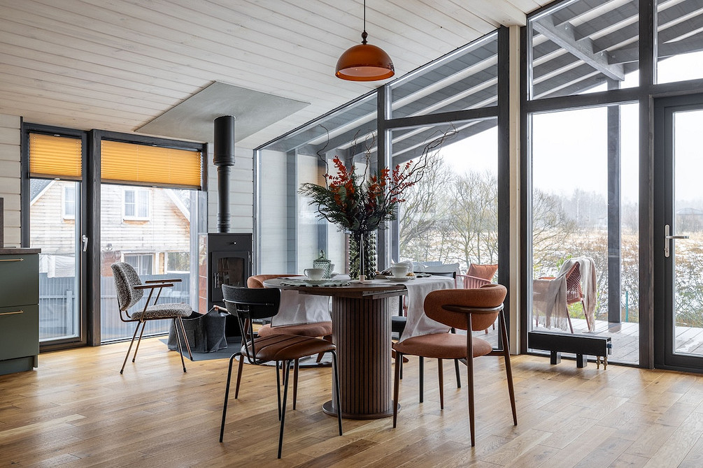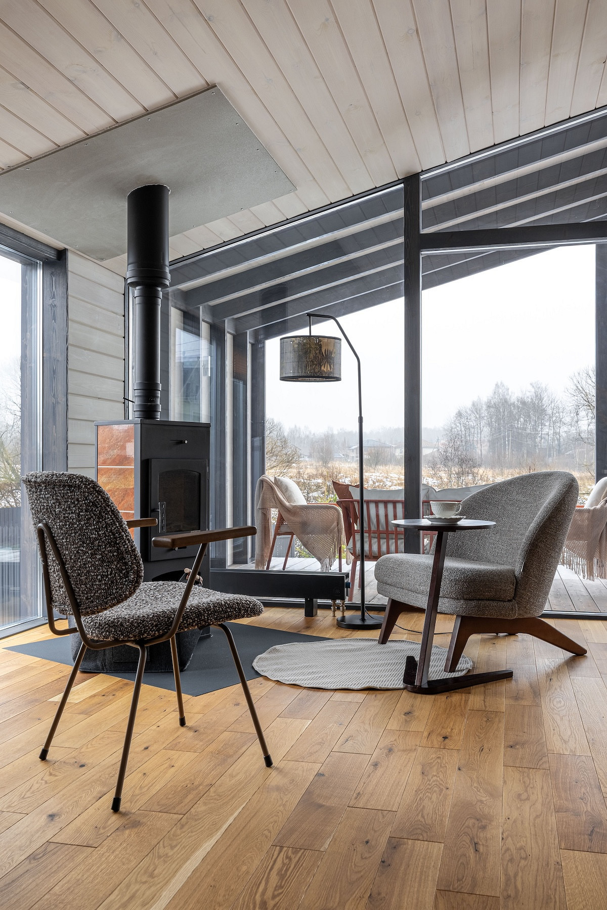 Также в кухне-гостиной есть печка, вокруг которой создали мобильную зону отдыха — кресла и стулья можно легко двигать при необходимости.