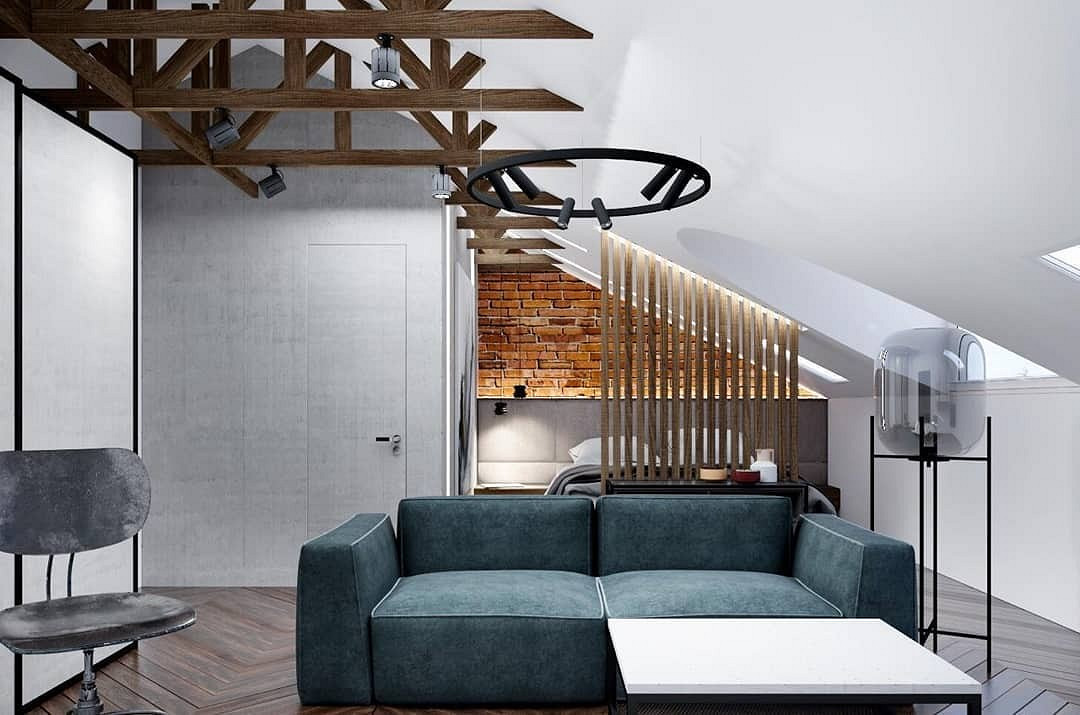 Второй уровень дома хорошо подходит для обустройства гостиной, несмотря на то, что это кажется нетипичным решением. В дизайне можно подчеркнуть деревянные балки под крышей, покрасив их в насыщенный коричневый, оформить пол паркетом или ламинатом того же оттенка. Отведите главное место под большой мягкий диван, подвесьте к потолку кресло-корзину, чтобы создать атмосферу комфорта и расслабленности.
