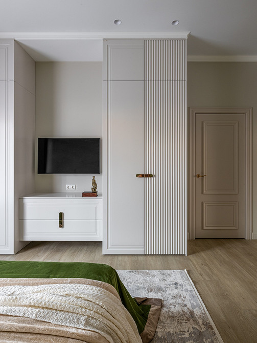 Основная отделка стен — краска с гладкой текстурой, которую можно мыть. На пол уложен SPC-ламинат по всей площади, включая ванную комнату и прихожую. Такой выбор сделали для создания покрытия без порогов и использования теплого пола. В комнате хозяев с прилегающей гардеробной в отделке стен использовали декоративную штукатурку с эффектом шелка на стене в изголовье кровати. Активно задействовали молдинги в оформлении стен, что соответствует стилю неоклассика и делает окрашенные поверхности визуально интереснее.