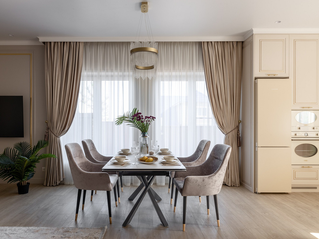 В неоклассическом интерьере светильники часто являются элементом декора, украшают интерьер. Так и в этом доме. Конечно, предусмотрено современное освещение в виде незаметных точечных светильников, но люстры обращают на себя много внимания. Например, в гостиной люстра как будто акцентирует саму зону, люстра над обеденным столом служит той же цели. Пара же ярких подвесов над островом перекликаются по цвету и дизайну с окантовкой римской шторы на кухонном окне.