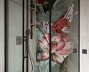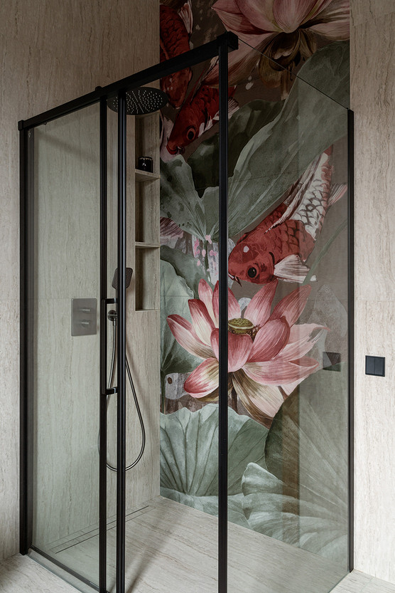 Стены в мастер-ванной отделаны керамогранитом под травертин с красивым керамическим панно с рисунком в душевой. Столешница и стена над раковиной выполнены из кварцита.